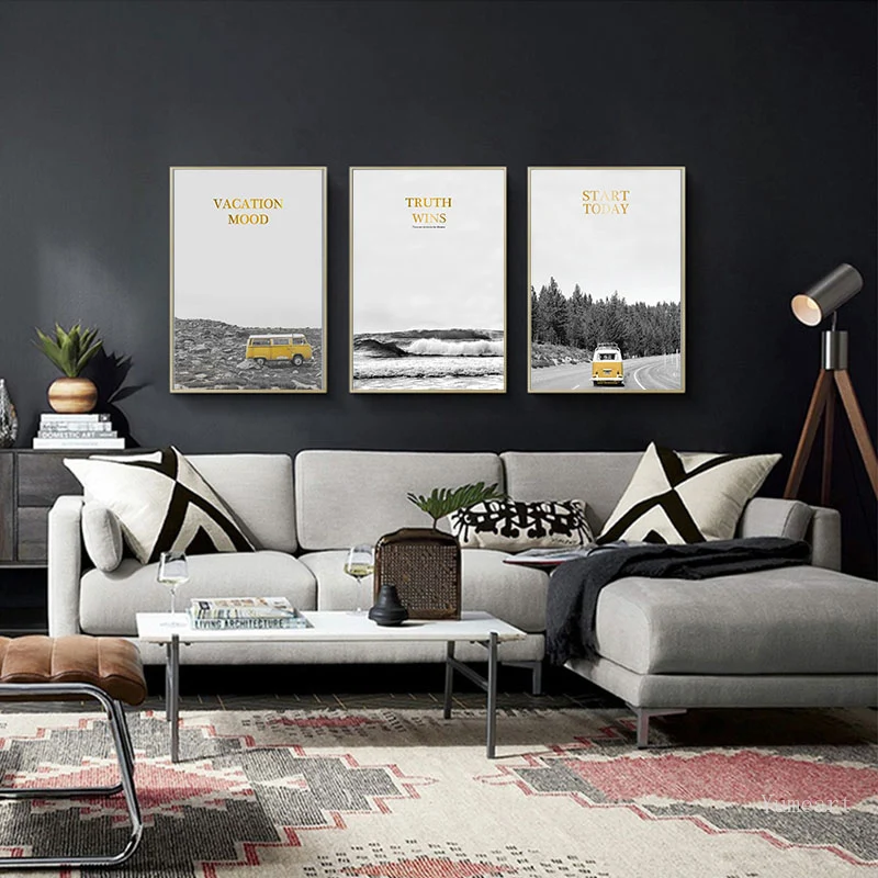 Современный плакат с желтым автобусом и лодкой, морской плакат, принты, черный, белый, скандинавский стиль, настенная Картина на холсте, поп-картина для гостиной