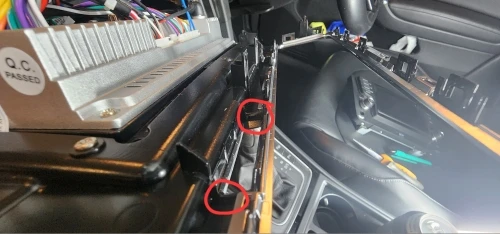 Группа очень хорошая, все работает хорошо. Очень быстрый и отзывчивый, отличный дисплей. Проблема была в том, что вентиляционное отверстие не скользит. Мне пришлось удалить немного пластика с файлом из рамки, чтобы снова открыть/закрыть вентиляционные отверстия. Я выделил это красным на изображении. Беспроводной андроид авто и Apple автомобиль играют обе работы.