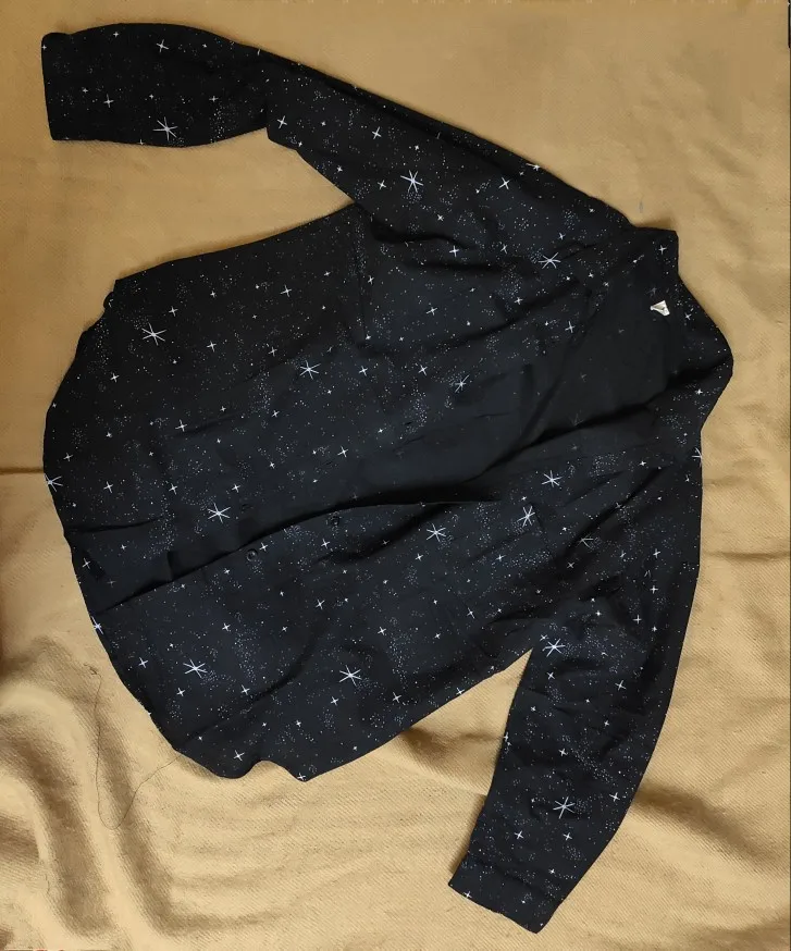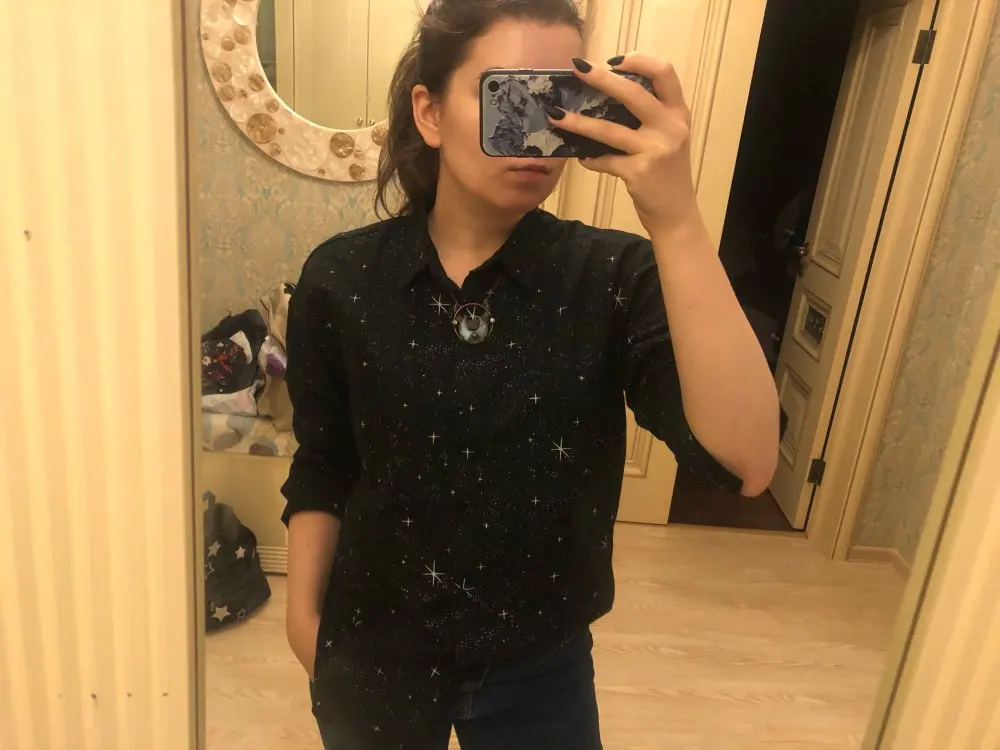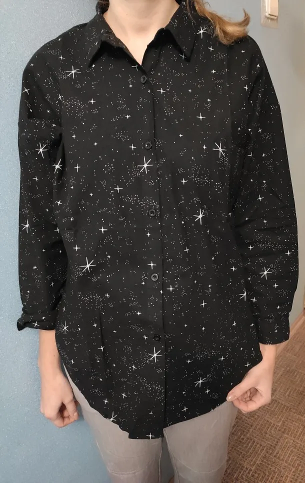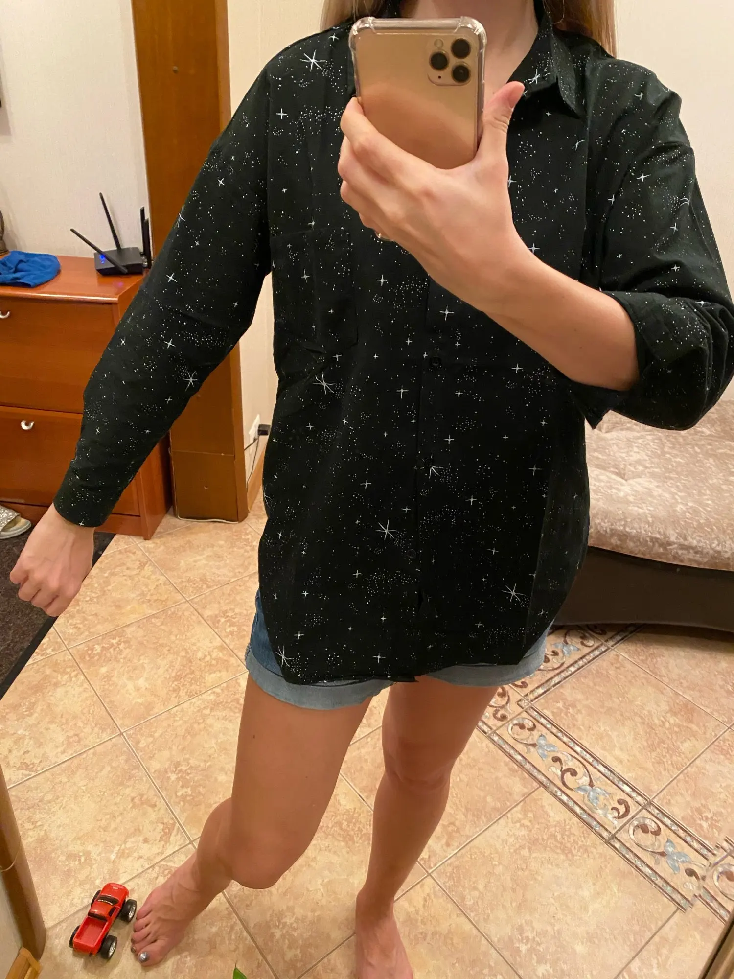 Супер рубашка! Из хлопка, ну материал точно натуральный и приятный. Крой свободный, грудь влезет(у кого есть) у меня нет, и поэтому хотелось бы более зауженный силуэт). Но мне рубашка очень нравится! Стирала несколько раз, в первый в тазике, побоялась что много краски будет и да, вода хоть и не чёрная была но покрасила бы вещи точно. Рисунок "звездочек" держится, всё ок)!