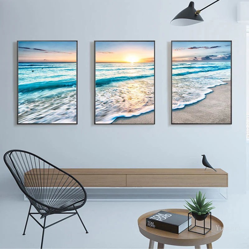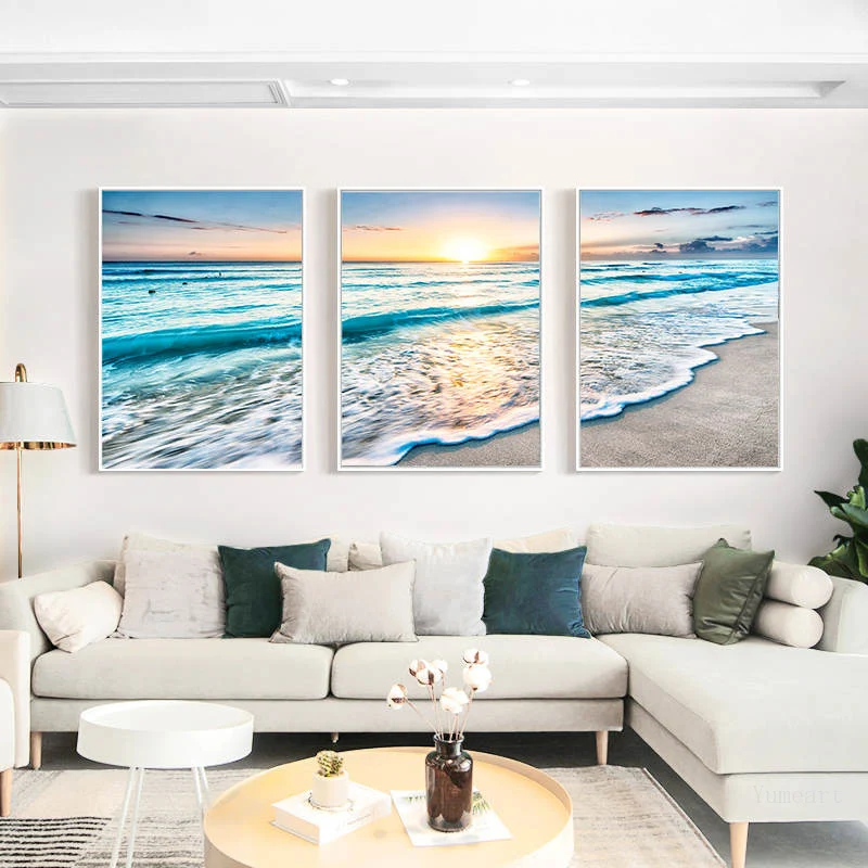 Постер для фотосъемки на пляже с изображением восхода и прибрежной зоны, изображение с синим морским пейзажем, волны, печать на холсте, Настенная картина для пляжа