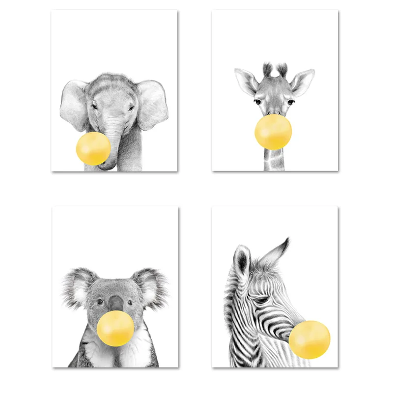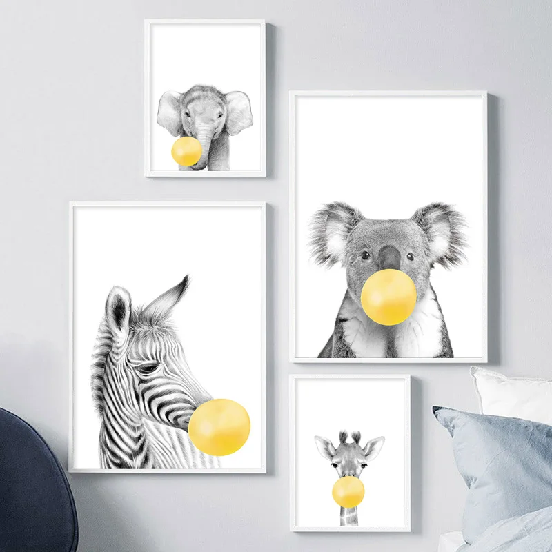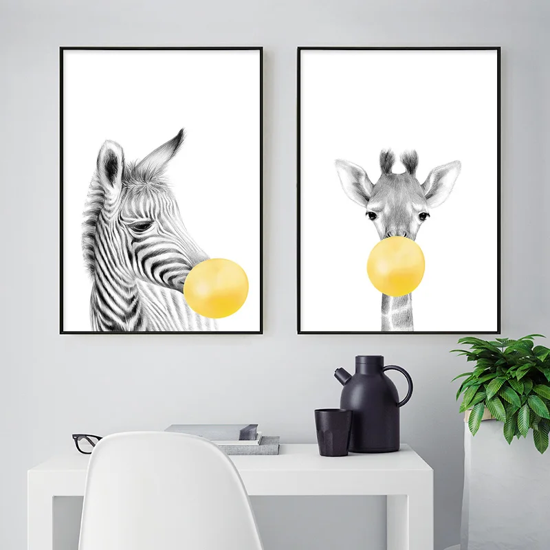 Жираф плакаты с зеброй и художественная печать на холсте Живопись желтый пузырь животных нордическая детская настенная живопись для декора гостиной