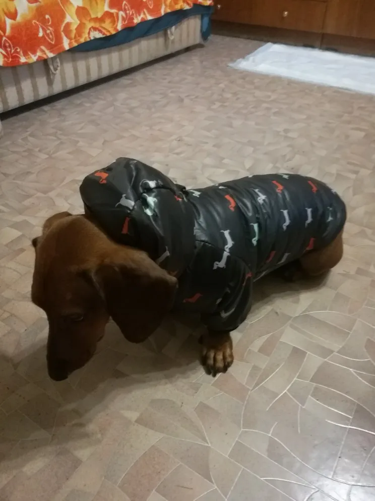 У меня шпиц 35см спинка,грудка 45 см.заказала L ,курточка отличная,но нам малая,нужно было на размер больше.