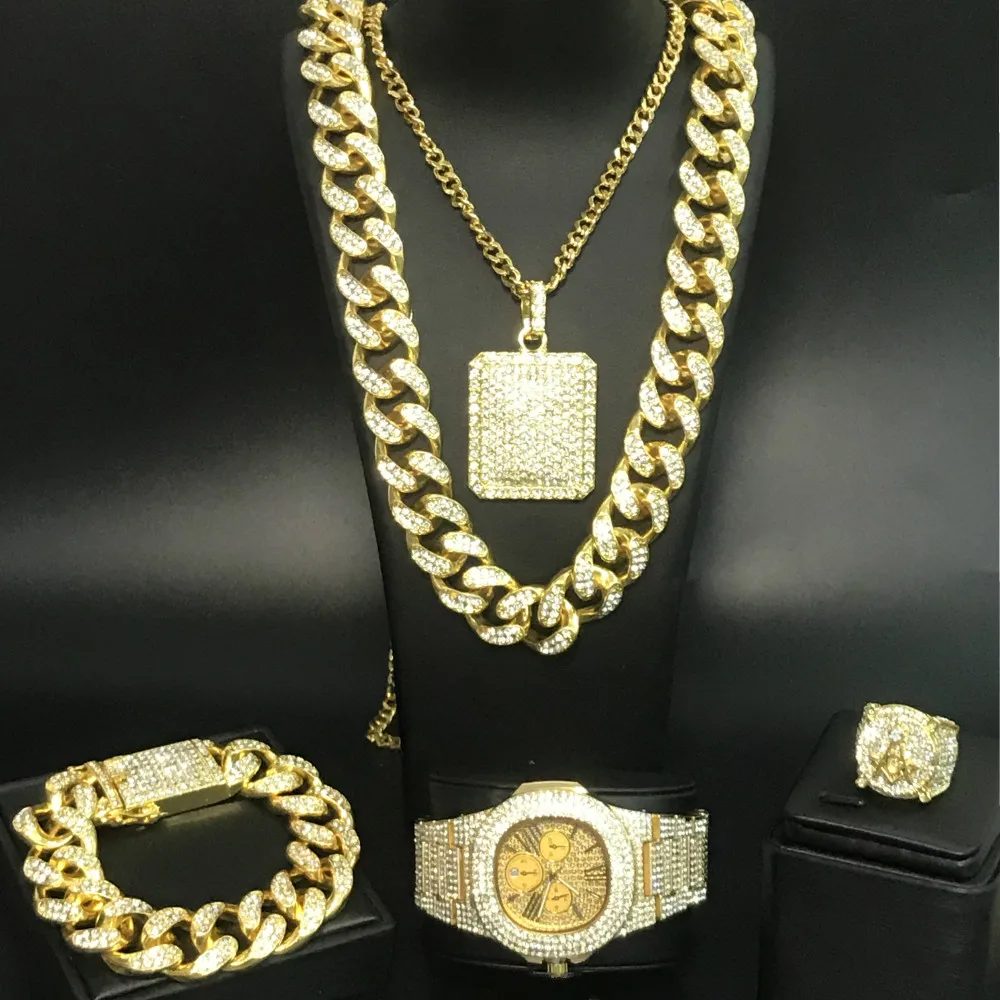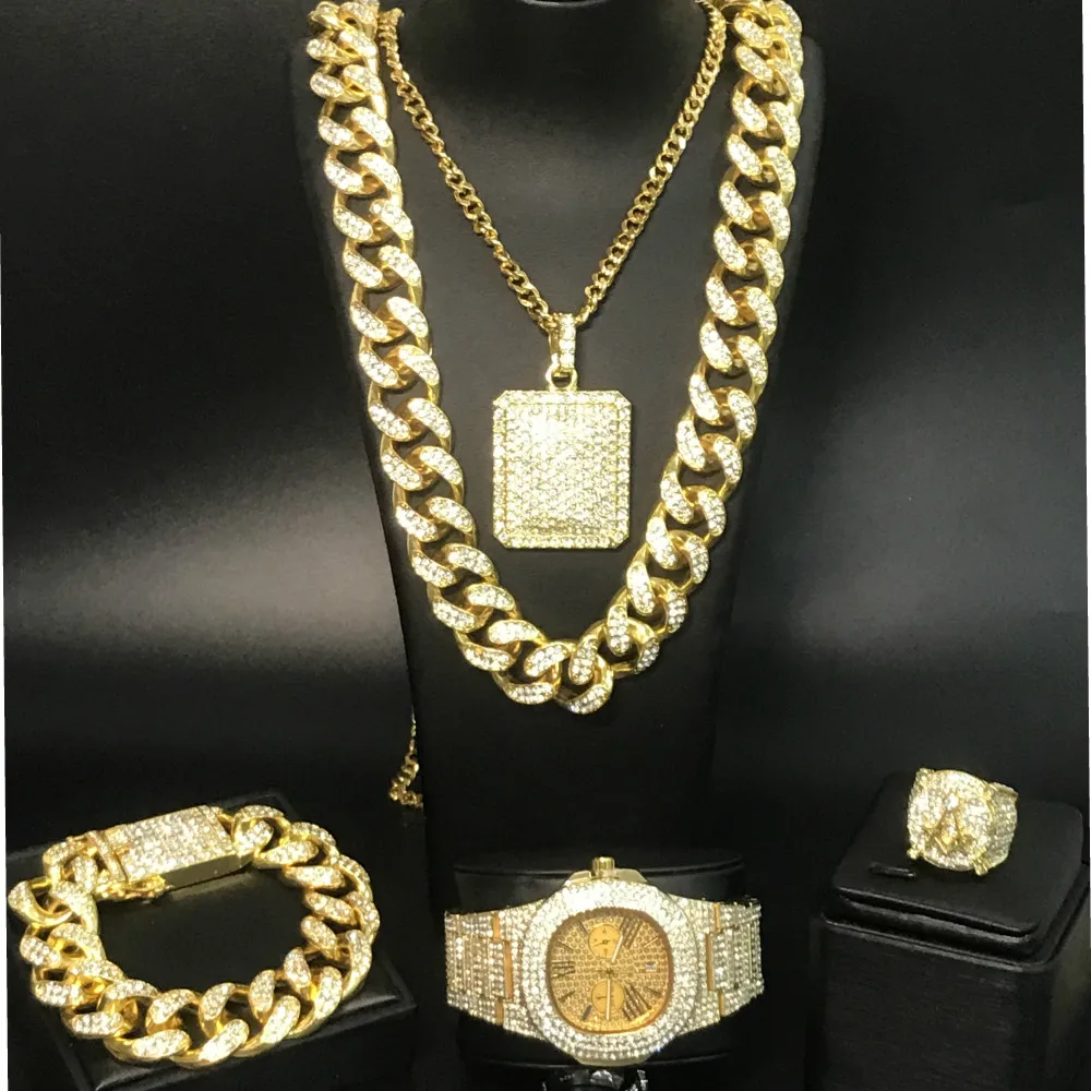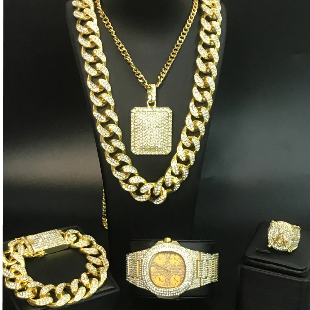 Роскошные мужские часы, браслет, ожерелье и кольцо комбинированный набор ледяных кубинских часов хип-хоп хрустальное ожерелье Майями цепи ювелирные изделия для мужчин