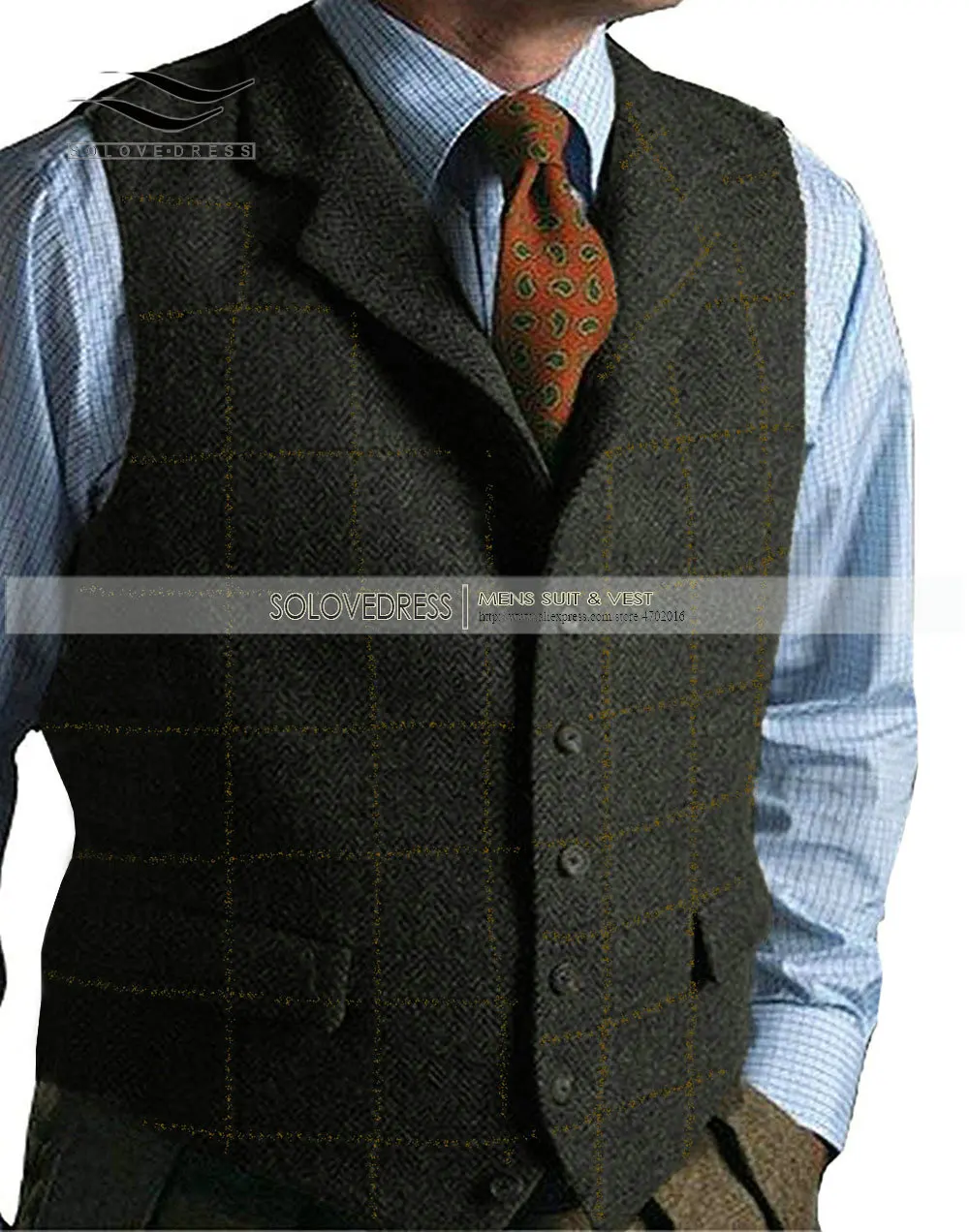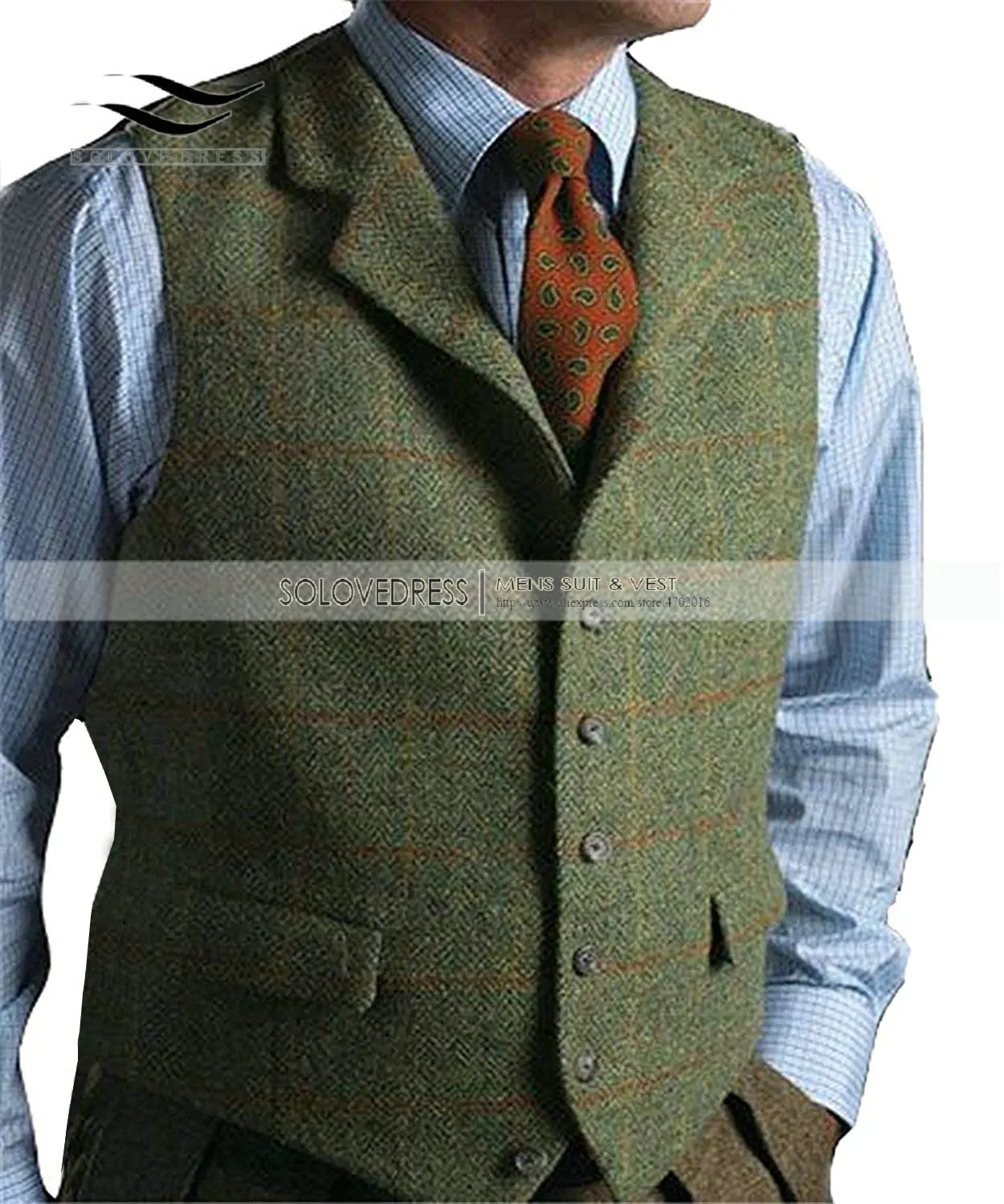 Мужской твидовый жилет, зеленый шерстяной жилет, приталенный клетча...