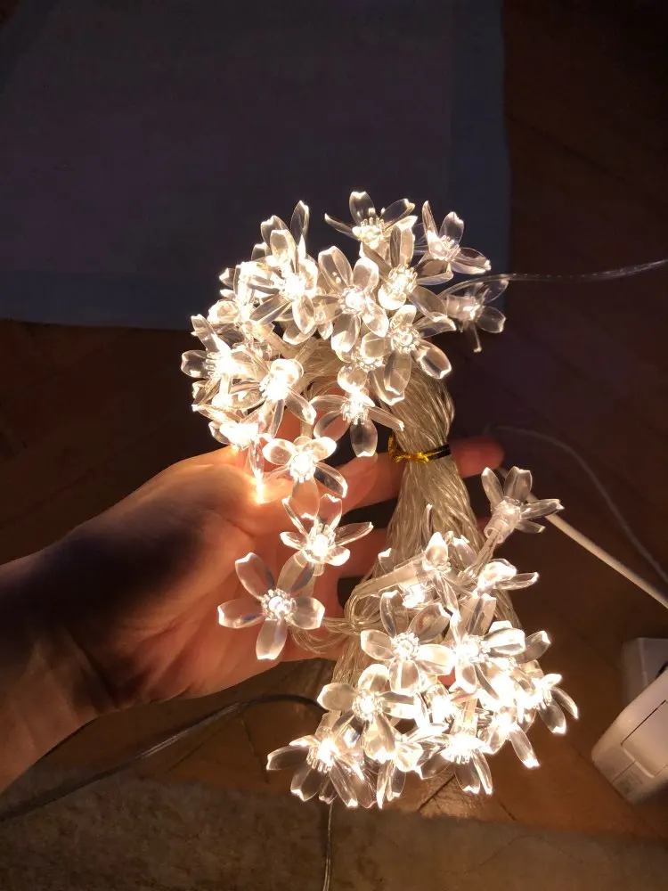 Они прекрасны, прямо как на картинке. Материал лепестков резиновый, Свет теплый и довольно яркий, не сильно блестящий и мало весит. Я люблю их. Я рекомендую их.