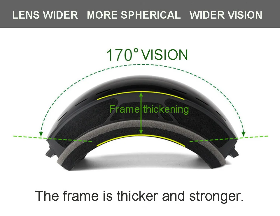 Сферический Сверхширокий обзор и Плавная вентиляция-Панорамная Конструкция объектива обеспечивает обзор более чем на 180 градусов и СВЕРХЧЕТКОЕ изображение. Двусторонняя система вентиляции усиливает воздушный поток и обеспечивает лучшую устойчивость к туману и комфортное ношение в теплом и влажном состоянии в течение всего дня.