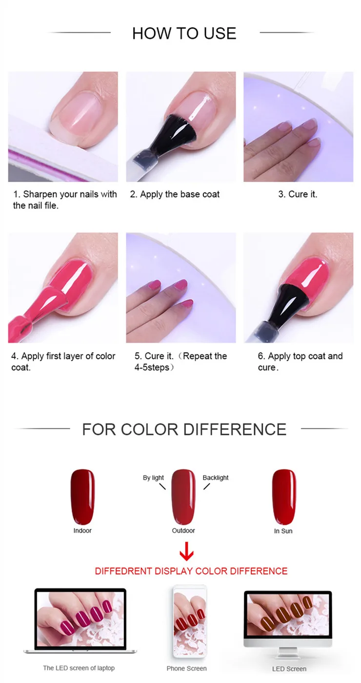 Характеристики: Вес нетто: 8 мл Количество: 1 бутылка Содержимое упаковки: 1 бутылка 8 мл УФ-Гель-лак NEE JOLIE особенность: 100% новая розничная продажа и высокое качество. Подходит для нанесения на УФ-гелевые ногти, акриловые ногти и натуральные ногти и т. Д. Помогает укрепить ногти с прочным блестящим покрытием. Идеально подходит как для профессионального использования, так и для личного использования. Профессиональное использование: Шаг 1. Очистите ногти, затем поверхность ногтей как обычный процесс. Шаг 2. Полностью встряхните Гель-лак, он может сделать Гель-лак сбалансированным. (ВАЖНО) шаг 3. Сначала нанесите базовый слой, который может сделать лак длительным, вылечите УФ-лампой или светодиодной лампой. (Необходимо) Шаг 4. Нанесите первый слой цветного гель-лака непосредственно, закрепите УФ-лампой в течение 2 минут или вылечите светодиодной лампой в течение 60 секунд. Шаг 5. Нанесите второй слой цветного гель-лака, а затем немедленно закрепите УФ-лампой в течение 2 минут или вылечите светодиодной лампой в течение 60 секунд. Шаг 6. Покрытие без протирания, излечивается УФ-лампой или светодиодной лампой. Как удалить УФ-гель для ногтей:-Замочите ногти в стеклянной миске, заполненной небольшим количеством ацетона, или оберните каждый ноготь в ватную подкладку, смоченную ацетоном, примерно на 5-10 минут. -Продукт начнет становиться мягким, и вы можете аккуратно отпилить его или сдвинуть с помощью небольшой деревянной палочки.