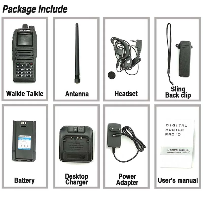 1 х Baofeng DM-1701 (VHF136-174 & UHF 400-470 МГц) 1 литий-ионный аккумулятор (7,4 V 2200mah) 1 x двухдиапазонная антенна Настольное зарядное устройство-1 шт. (Вилка стандарта США/ЕС/Великобритании/Австралии) 1 x адаптер питания 1 Зажим для ремня 1 х слинг 1 xГарнитура 1 xРуководство пользователя