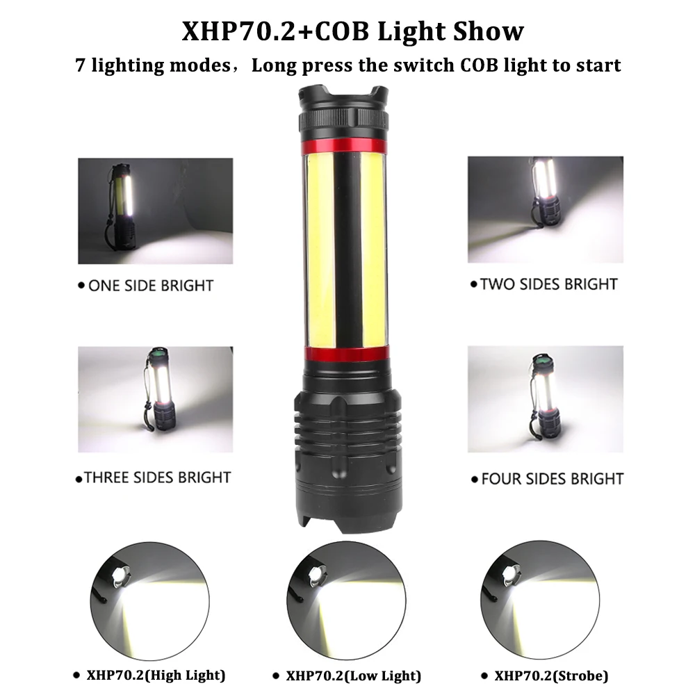 XHP70.2 светодиодный 3 режима: сильный светильник-слабый светильник-вспышка Долгое нажатие для переключения света COB 4 * COB 4 режима: одна сторона яркая, две стороны яркая, три стороны яркая, четыре стороны яркая Способ зарядки: зарядка через micro USB