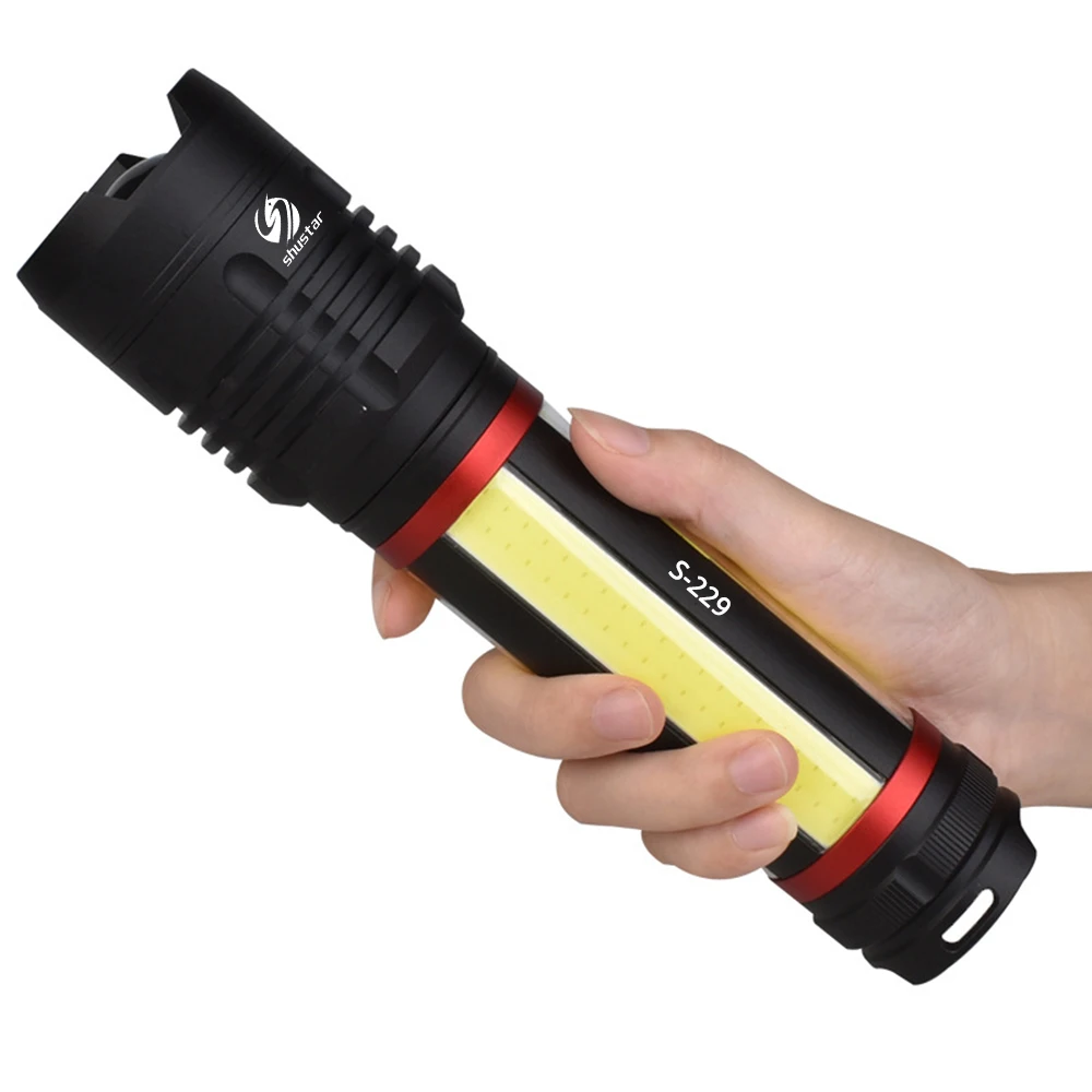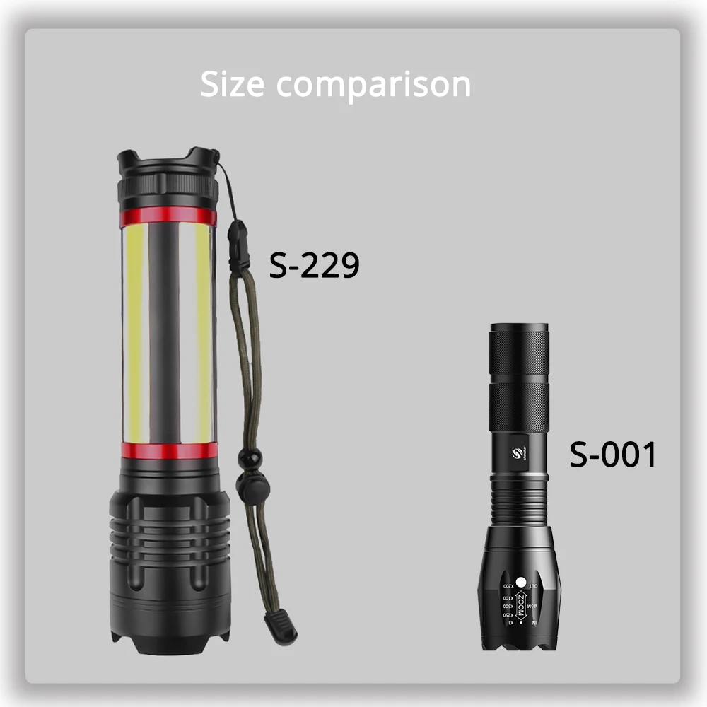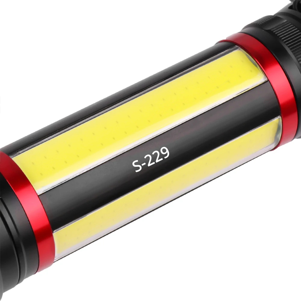 Бренд: Shustar Модель: S-229 Светильник почка: XHP70.2 + COB LED Размер: 23*5,5*5 см Вес нетто: 691 г Материал: алюминиевый сплав Переключатель: нажмите переключатель Аккумулятор: встроенный полимерный литиевый аккумулятор 5000 мАч Режимы переключения: 3 режима: сильный светильник-слабый светильник-вспышка Долгое нажатие для переключения света COB 4 режима: одна сторона яркая, две стороны яркая, три стороны яркая, четыре стороны яркая Способ зарядки: зарядка через micro USB