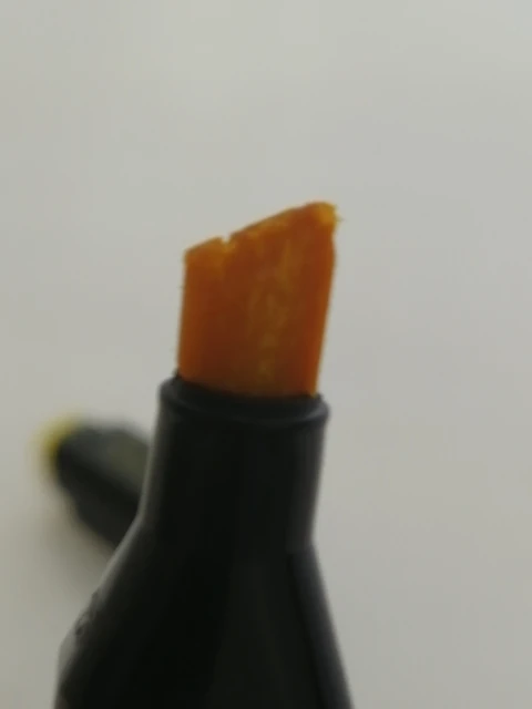 Заказывала 4 маркера разных цветов. Абсолютно каждый - с выдвинутым вперед долотом. Это как бы мелочь, потому что маркеры не засыхают, прекрасно вставляются обратно и живут чудесно. Просто удивляет, как не засохли по пути. Количество чернил в меру. Маркеры не текут, при этом достаточно влажно пишут. Есть легкое ощущение дешевизны (качество пластика ну так себе, но за свою цену ок). В общем, товаром довольна :)