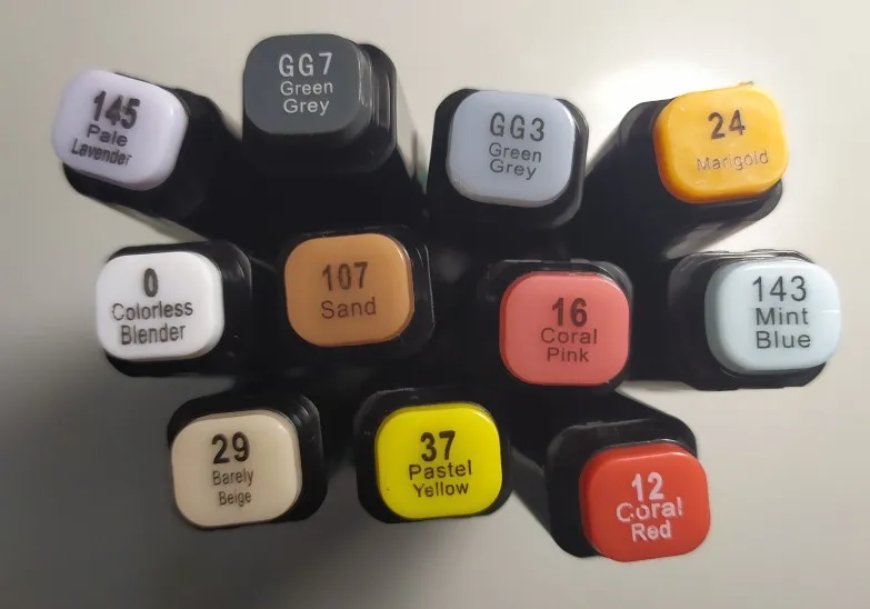 Заказ сделала 11.11 пришел 3.12. Продавец положил все цвета правильно. Все пишут хорошо. Корпус чёрный. У меня есть маркеры той же фирмы в белом цвете, там корпус немного лучше сделан. Черные меньше по весу и чуть более хлипкие, но, думаю, на рисование никак не повлияет. Ещё на белых со стороны пули есть серая линия на этих её нет, но это уже придирки)