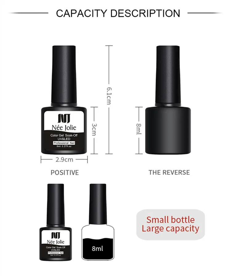 Характеристики: Вес нетто: 8 мл Количество: 1 бутылка Содержимое упаковки: 1 бутылка 8 мл УФ-Гель-лак NEE JOLIE особенность: 100% новая розничная продажа и высокое качество. Подходит для нанесения на УФ-гелевые ногти, акриловые ногти и натуральные ногти и т. Д. Помогает укрепить ногти с прочным блестящим покрытием. Идеально подходит как для профессионального использования, так и для личного использования. Профессиональное использование: Шаг 1. Очистите ногти, затем поверхность ногтей как обычный процесс. Шаг 2. Полностью встряхните Гель-лак, он может сделать Гель-лак сбалансированным. (ВАЖНО) шаг 3. Сначала нанесите базовый слой, который может сделать лак длительным, вылечите УФ-лампой или светодиодной лампой. (Необходимо) Шаг 4. Нанесите первый слой цветного гель-лака непосредственно, закрепите УФ-лампой в течение 2 минут или вылечите светодиодной лампой в течение 60 секунд. Шаг 5. Нанесите второй слой цветного гель-лака, а затем немедленно закрепите УФ-лампой в течение 2 минут или вылечите светодиодной лампой в течение 60 секунд. Шаг 6. Покрытие без протирания, излечивается УФ-лампой или светодиодной лампой. Как удалить УФ-гель для ногтей:-Замочите ногти в стеклянной миске, заполненной небольшим количеством ацетона, или оберните каждый ноготь в ватную подкладку, смоченную ацетоном, примерно на 5-10 минут. -Продукт начнет становиться мягким, и вы можете аккуратно отпилить его или сдвинуть с помощью небольшой деревянной палочки.