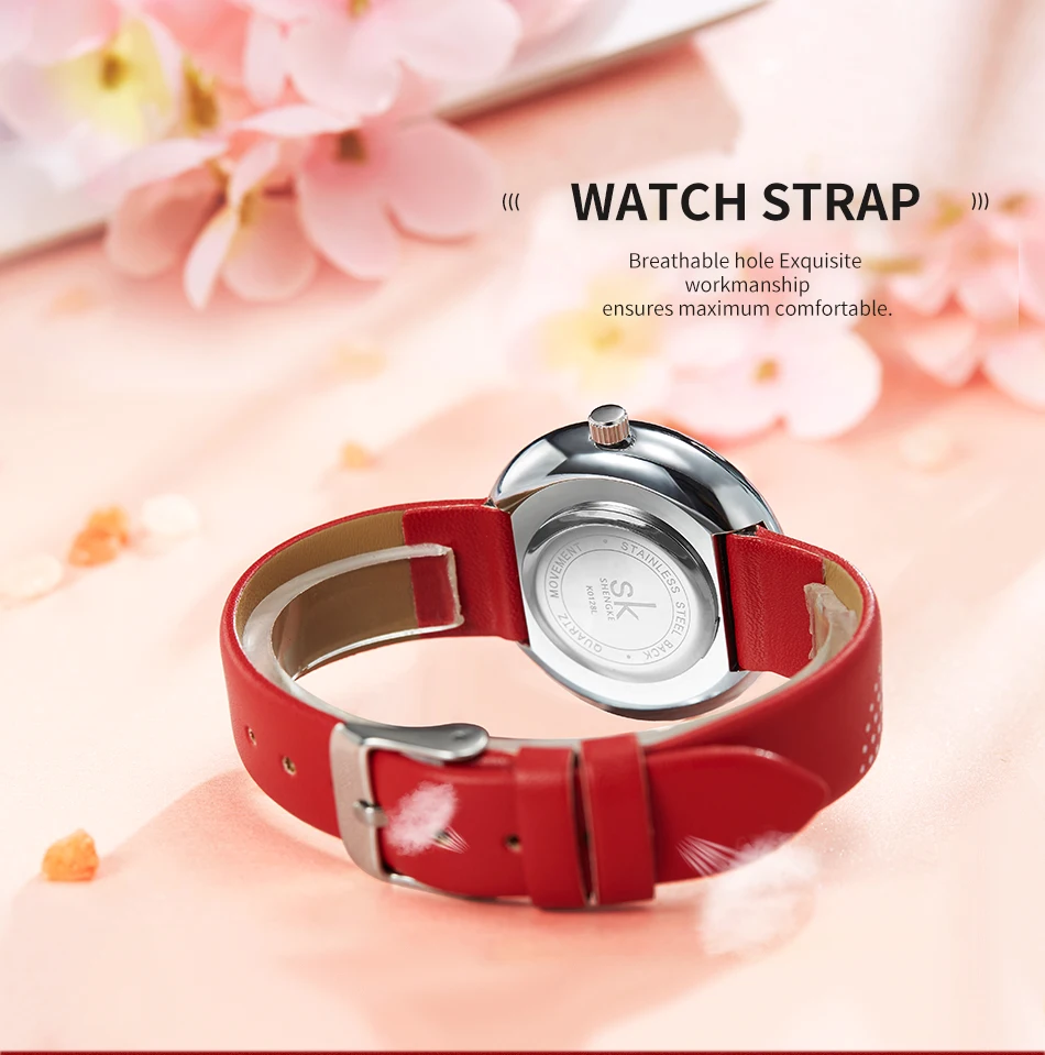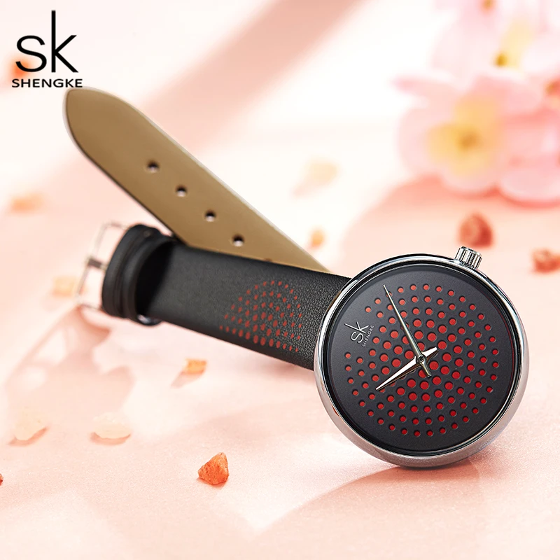 Часы Shengke женские кварцевые, дизайнерские креативные, с кожаным ремешком, с полым циферблатом, красные