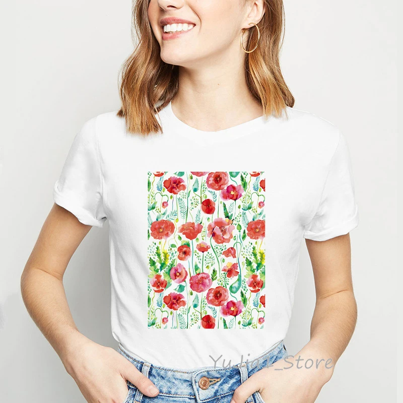 Белая футболка с акварельным принтом Красного мака и цветов, летние хипстерские женские футболки, повседневные топы, милые короткие футболки для девочек