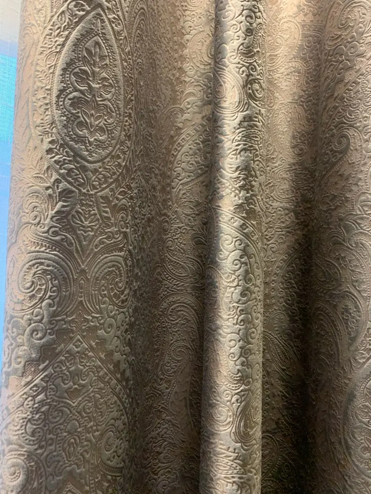 Шторы шикарные ! Ткань - плотный велюр с золотистым тиснением в виде узора , но « золото» деликатное , не вычурное . При определённой подсветке -переливается . Затемнение при закрытых полотнах почти полное , Брала для спальни , очень довольна . Пошив качественный , пришиты этикетки с информацией об уходе и составе ткани. Продавец контактный , в покупателе заинтересован . В подарок приложил подхваты . Фото загружу позже . Для наглядности )