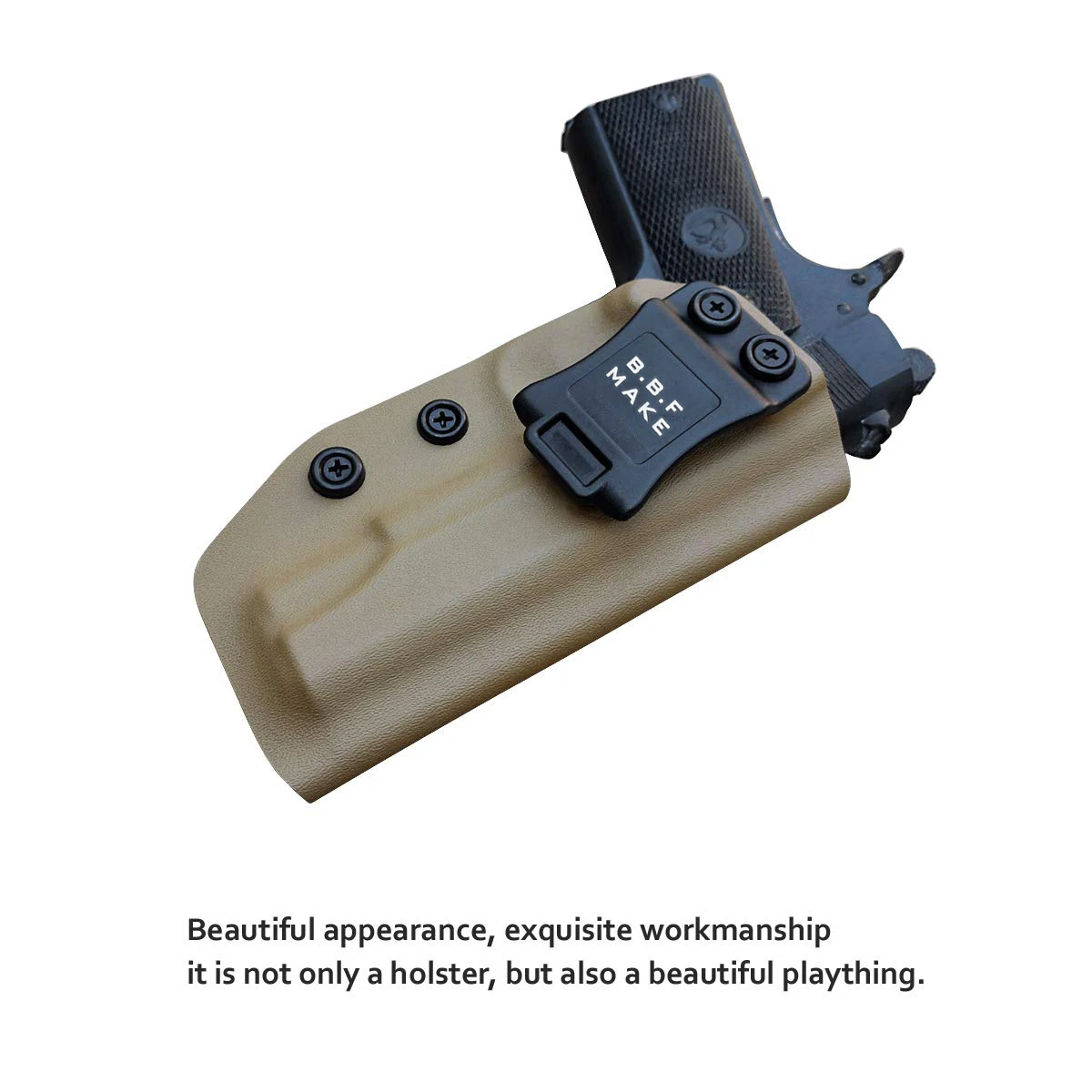 BBF сделать кобура ручной работы изготавливается из прочной 0,8 "KYDEX. Он не только водонепроницаемый, устойчивый к поту, но также обладает высокой прочностью, высокой прочностью, ударопрочностью, износостойкостью и устойчивостью к старению. Может использоваться в различных условиях. Таким образом, вы всегда можете положиться на него, чтобы сохранить свою жизнь.