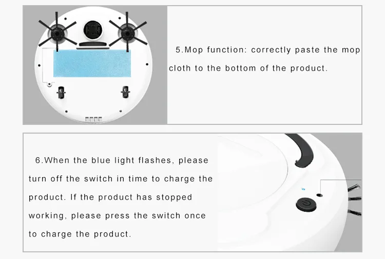 1. Режим переключения: нажмите переключатель хоста, и подметальная машина переходит в рабочий режим, чтобы светильник лампа. Нажмите переключатель хоста еще раз и выключите уборочную машину. 2. Режим зарядки: Подключите головку Micro USB кабеля к зарядному порту уборочной машины и подключите головку USB к преобразователю для зарядки. 3. Состояние зарядки: индикатор зарядки горит, указывая на то, что зарядка заряжается, а Выкл означает, что зарядка завершена, а общее время зарядки составляет около 2-3 часов.