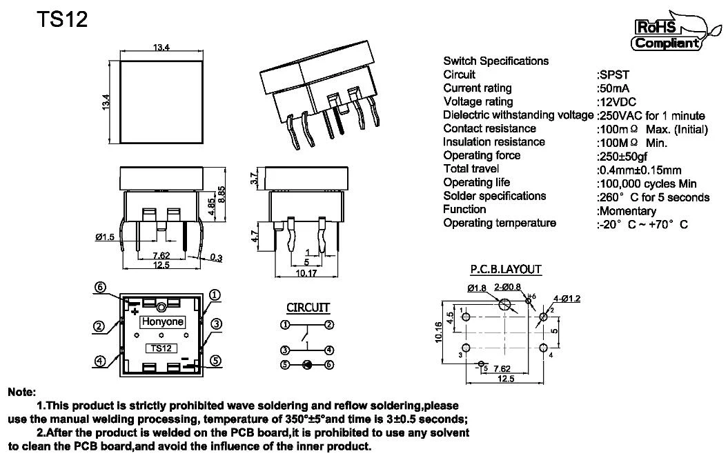 5 шт. TS12 серия 13,4*13,4 мм квадратный светодиодный мгновенным переключателем SPST PCB кнопочный выключатель