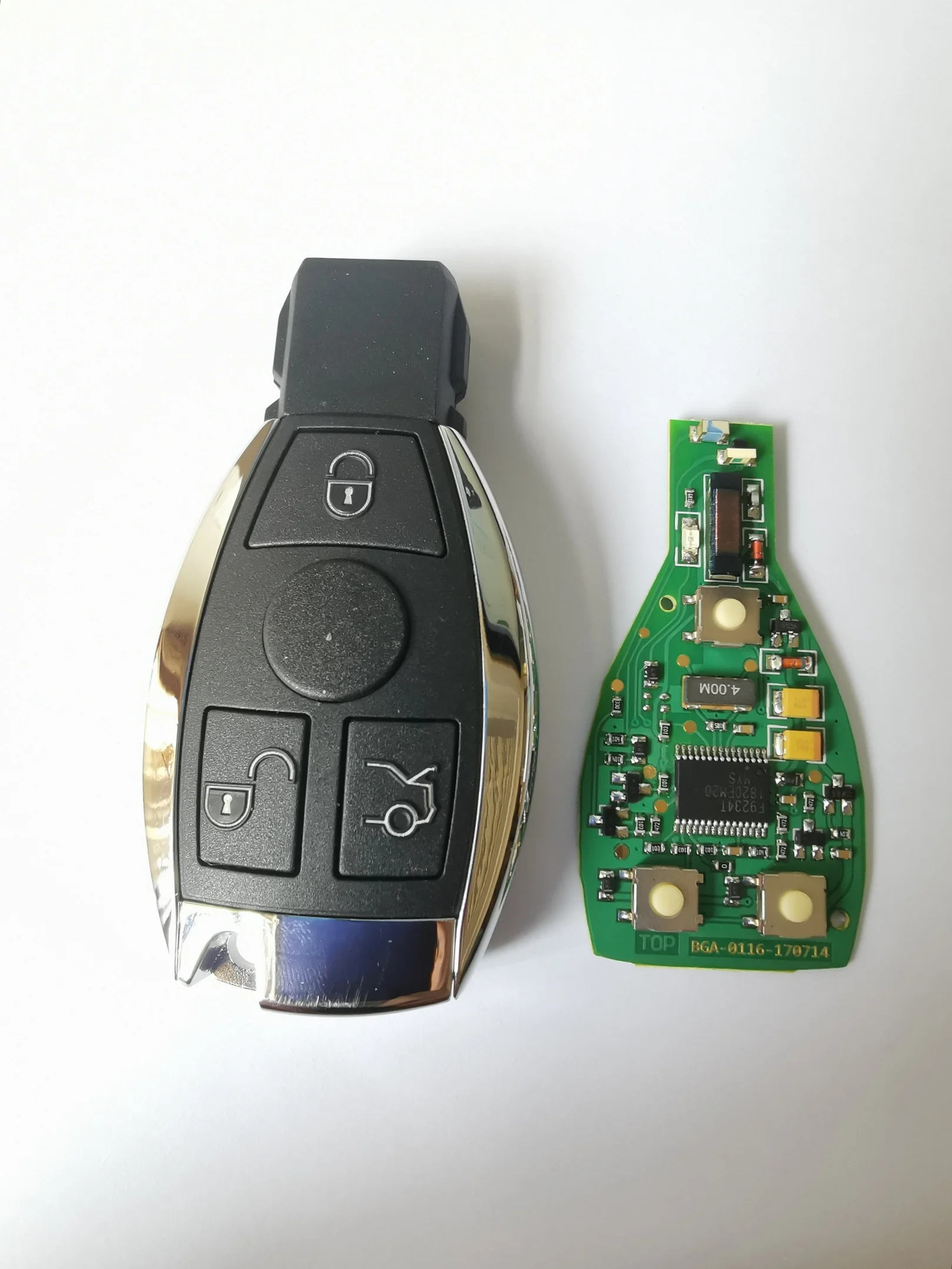 В пакете валялся логотип, но только половина - основание пластиковое. На нём следы, что туда что-тои было приклеено ранее, но нигде хромированной звёздочки не было. Для второго ключа в том-же заказе - всё было в комплекте. Частота на корпусе написана от балды, в описании сказано, что не влияет. ключи определяются как BE ключ, читаются и пишутся. Где звезду брать хз теперь.