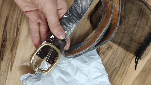 Хороший ремень, качественная фурнитура металлическая. Пришёл запакованный в пленку, есть запах небольшой, думаю выветрится. Долгая доставка до Москвы 2 месяца. С продавцом не общалась