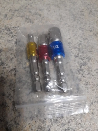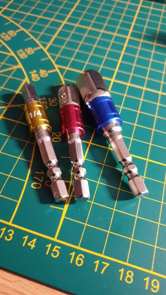 Not suitable (does not lock with) for use with a release mechanism like like the Magnetic Electric Screwdriver Extension Bit Holder: https://www.aliexpress.ru/snapshot/0.html?spm=a2g0s.buyer_leave_review.0.0.4de16c1bnqEcJ3&orderId=8124721366732896&productId=4001261525122. Nice to have different color per size.