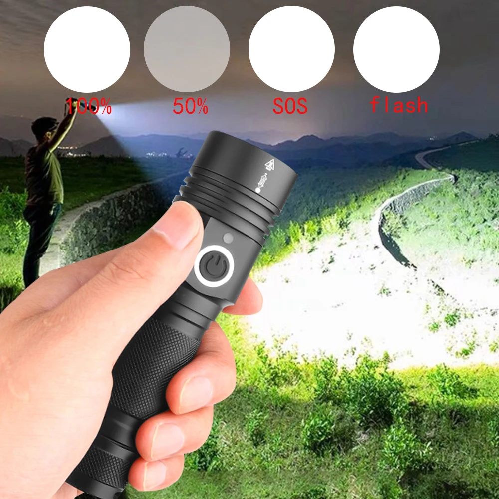 Мощный светодиодный фонарик использует лампу XHP50.2 светодиодный, максимальная мощность до 70000 люмен. Отображение емкости аккумулятора, телескопический зум. Micro usb для компьютера USB, автомобильного USB, USB-разъема для зарядки, зарядки фонарика. Изготовлен из алюминиевого сплава аэродинамического класса, надежный, жестко анодированный военный класс HAIII. Водонепроницаемый в соответствии с IPX-6, водостойкий, можно использовать в дождливую погоду, но нельзя класть в воду. Конструкция с магнитным хвостом для удобства использования. Подходит для работы, охоты, скалолазания, рыбалки, кемпинга, активного отдыха и т. д. Ударопрочность до 2 метров. Может выступать в качестве внешнего аккумулятора. Зарядка мобильного устройства и наличие самого запоминающего устройства, что эквивалентно смеси зарядного устройства и резервного аккумулятора