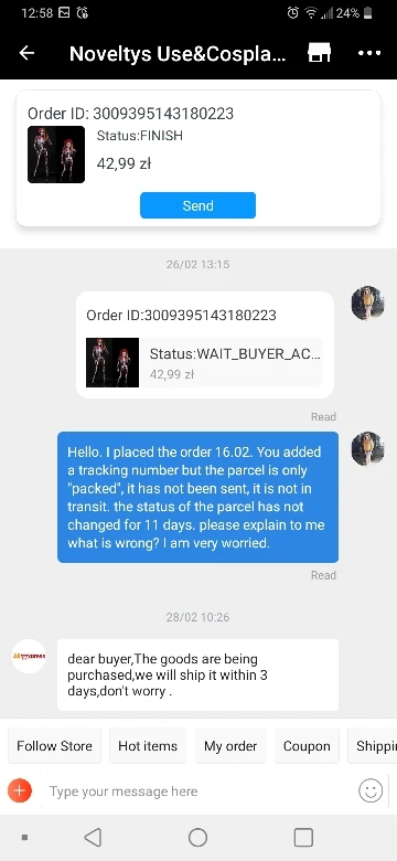 Пожалуйста, поймите, что потеря доставки, хотя и довольно редко, является частью онлайн-торговли, пожалуйста, будьте понятны, когда что-то вне контроля кого-либо влияет на время доставки (например, природные катаклизмы).