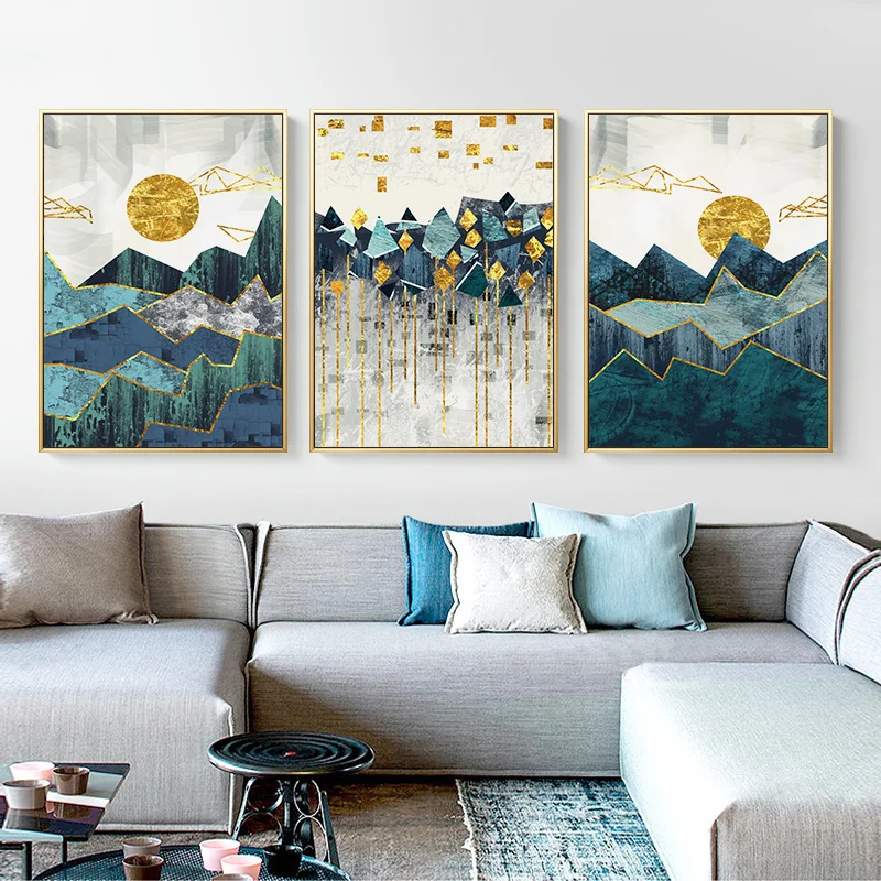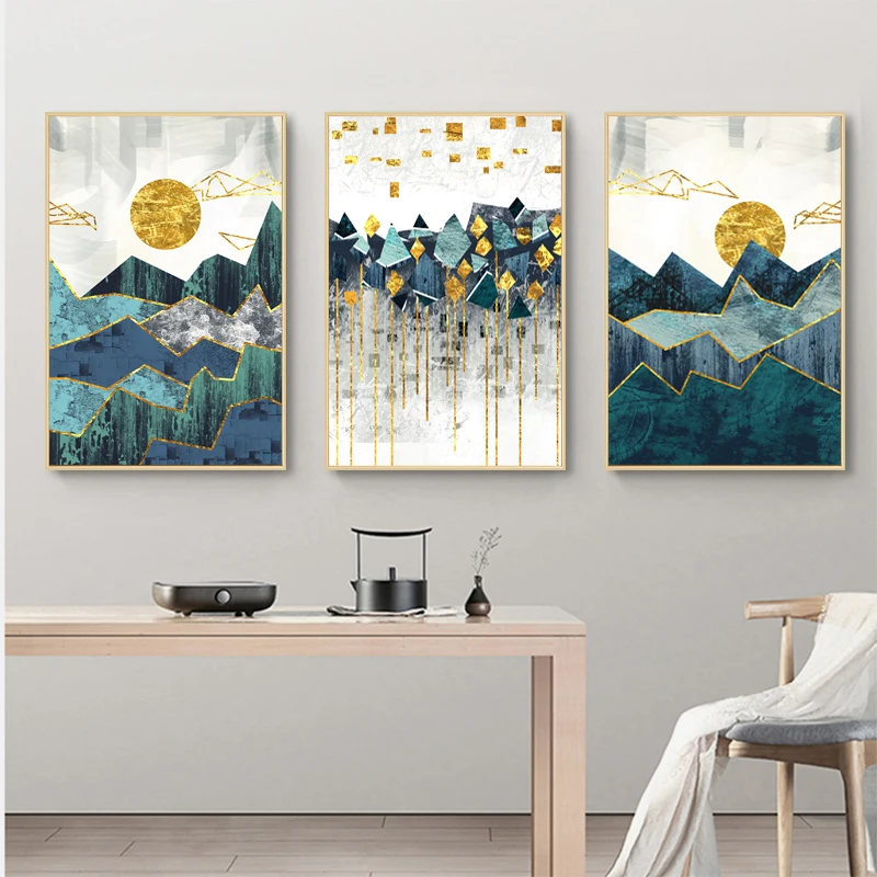 Скандинавские абстрактные геометрические горные пейзажи, настенная живопись, холст, картина золотое солнце, художественный плакат с принтом, Настенная картина для гостиной