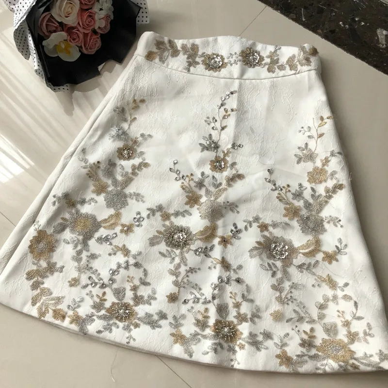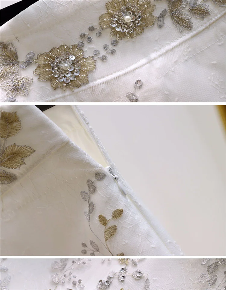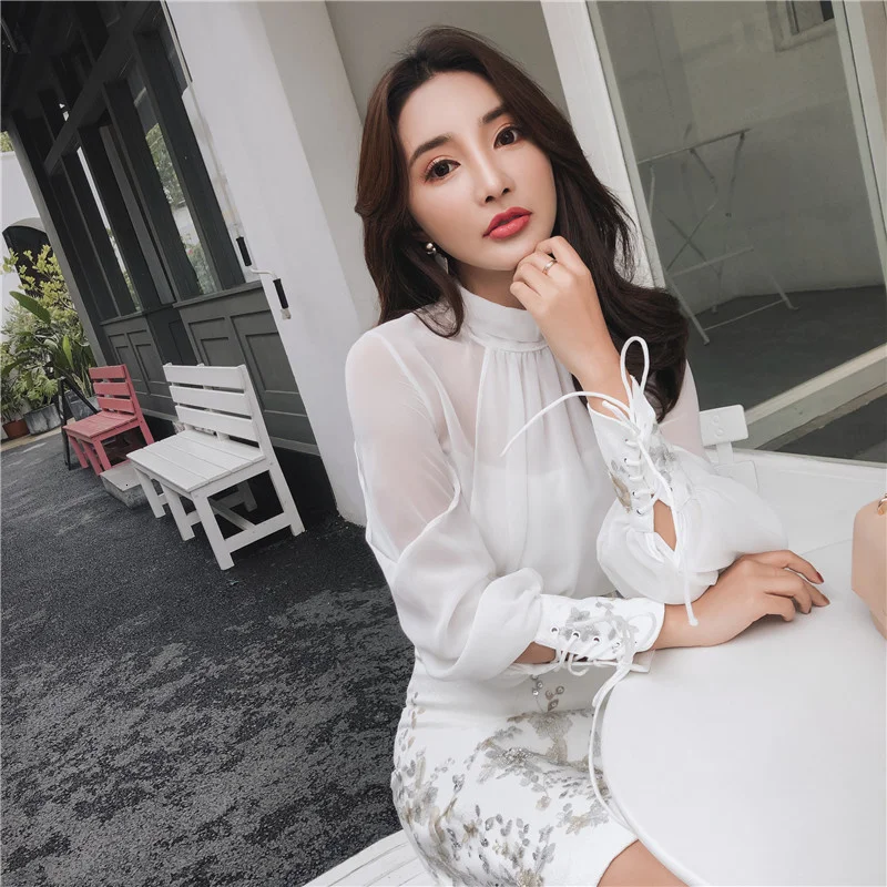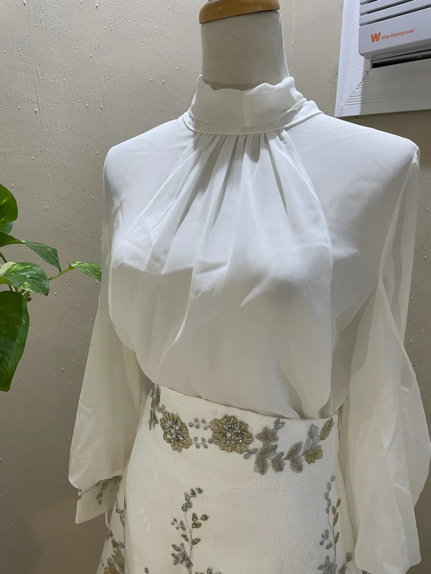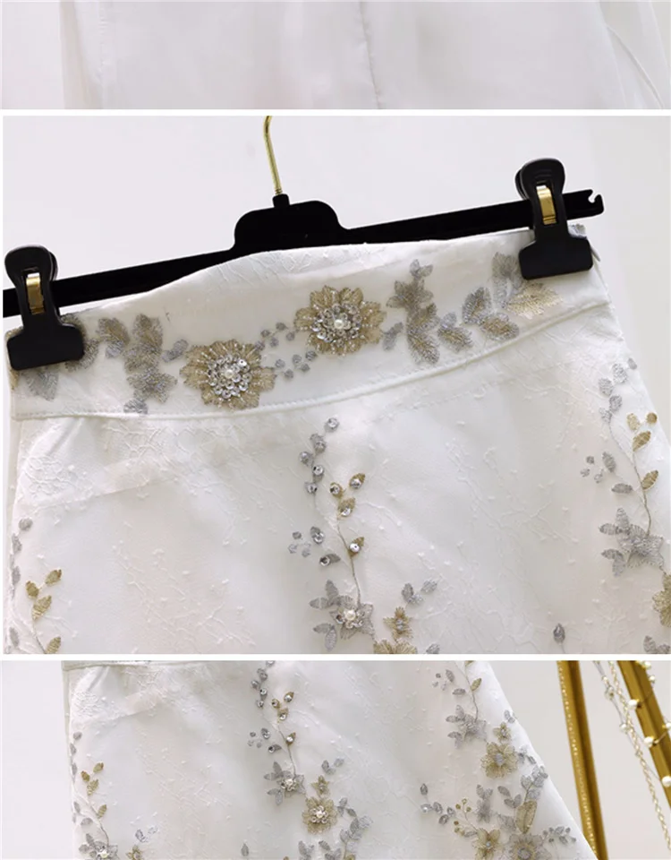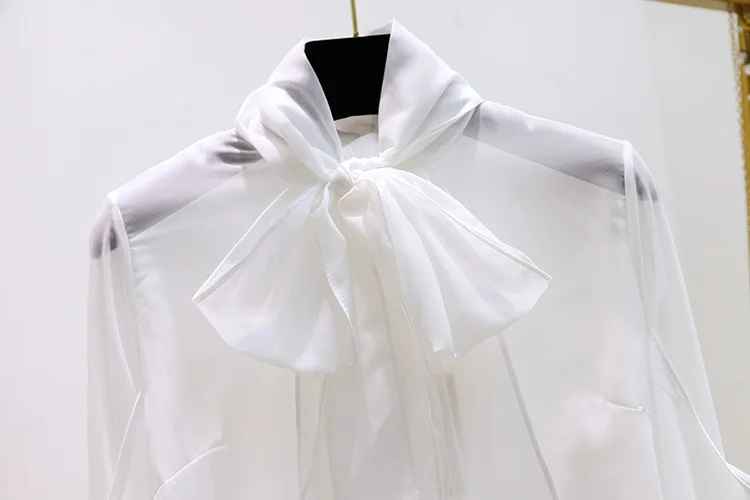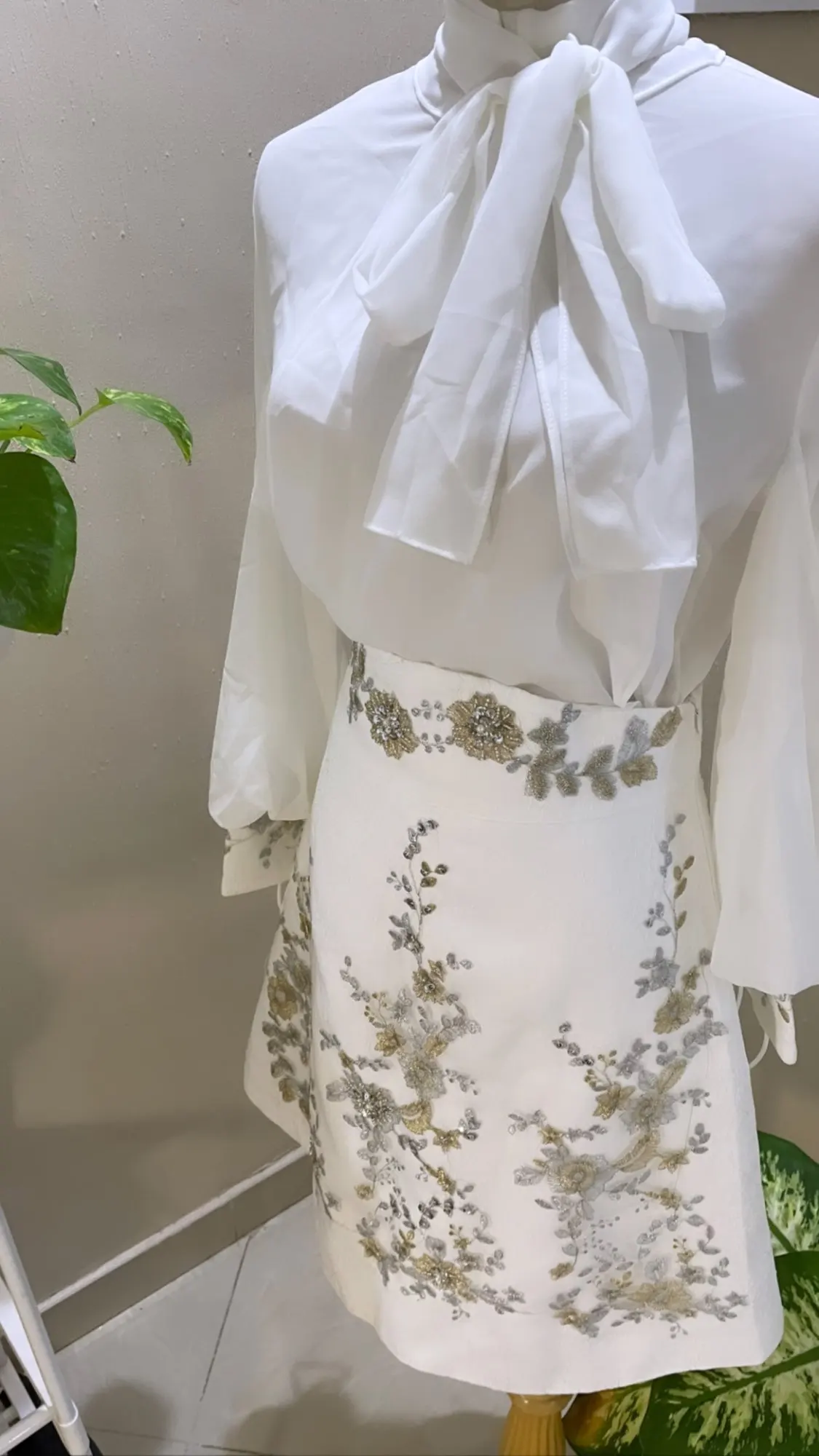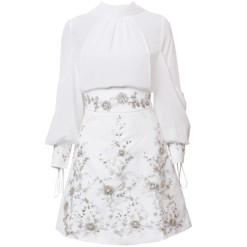 Женский модельный костюм с юбкой, шифоновая блузка с рукавами-фонариками и бантом + винтажная юбка с цветочной аппликацией из бисера, осень