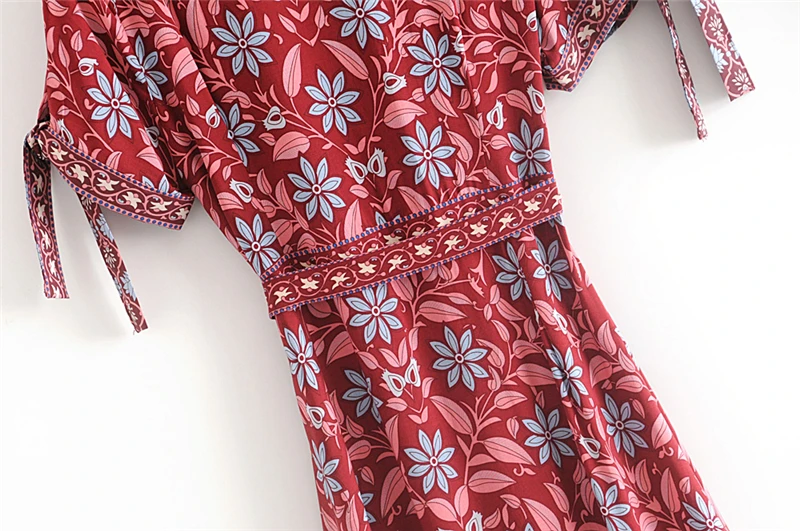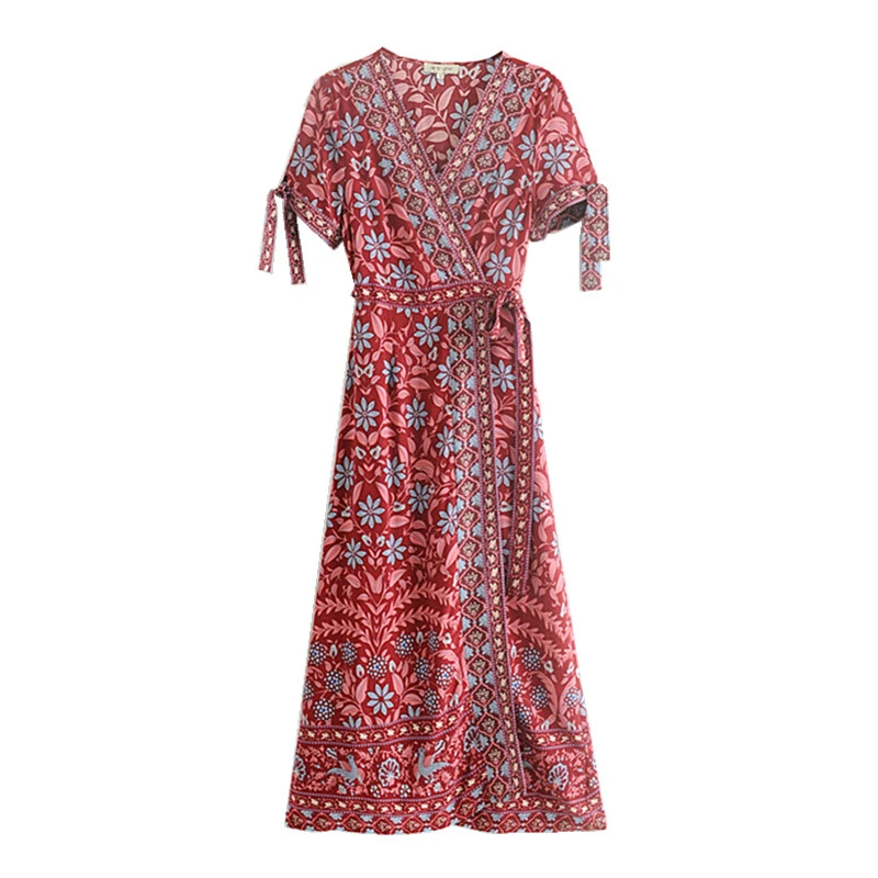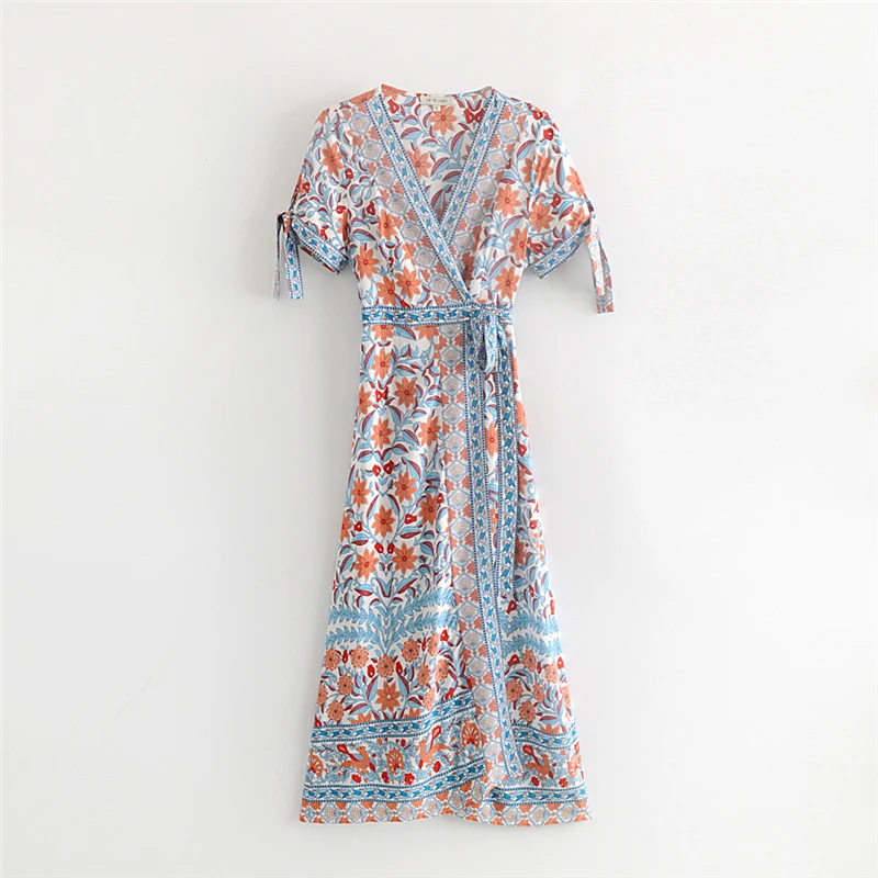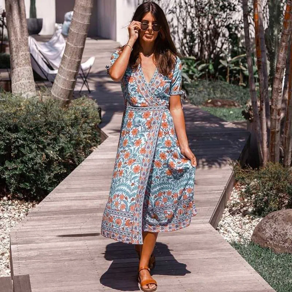 Женское пляжное платье с цветочным принтом, V-образным вырезом и коротким рукавом