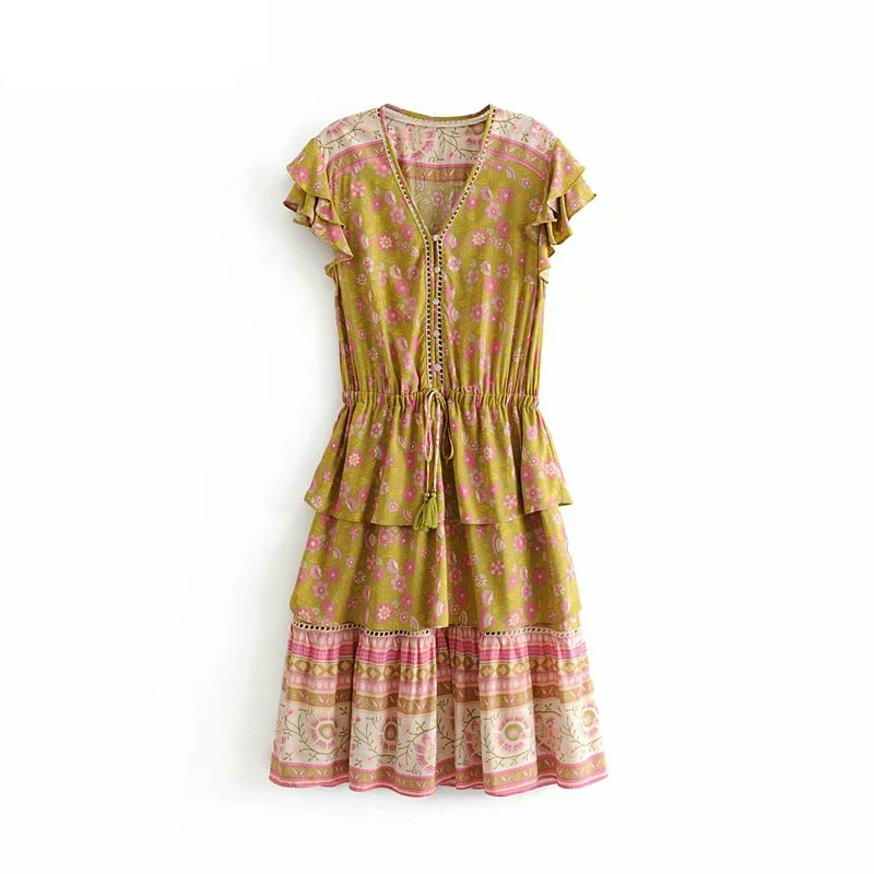 Женское винтажное платье-мини с цветочным принтом, V-образным вырез...