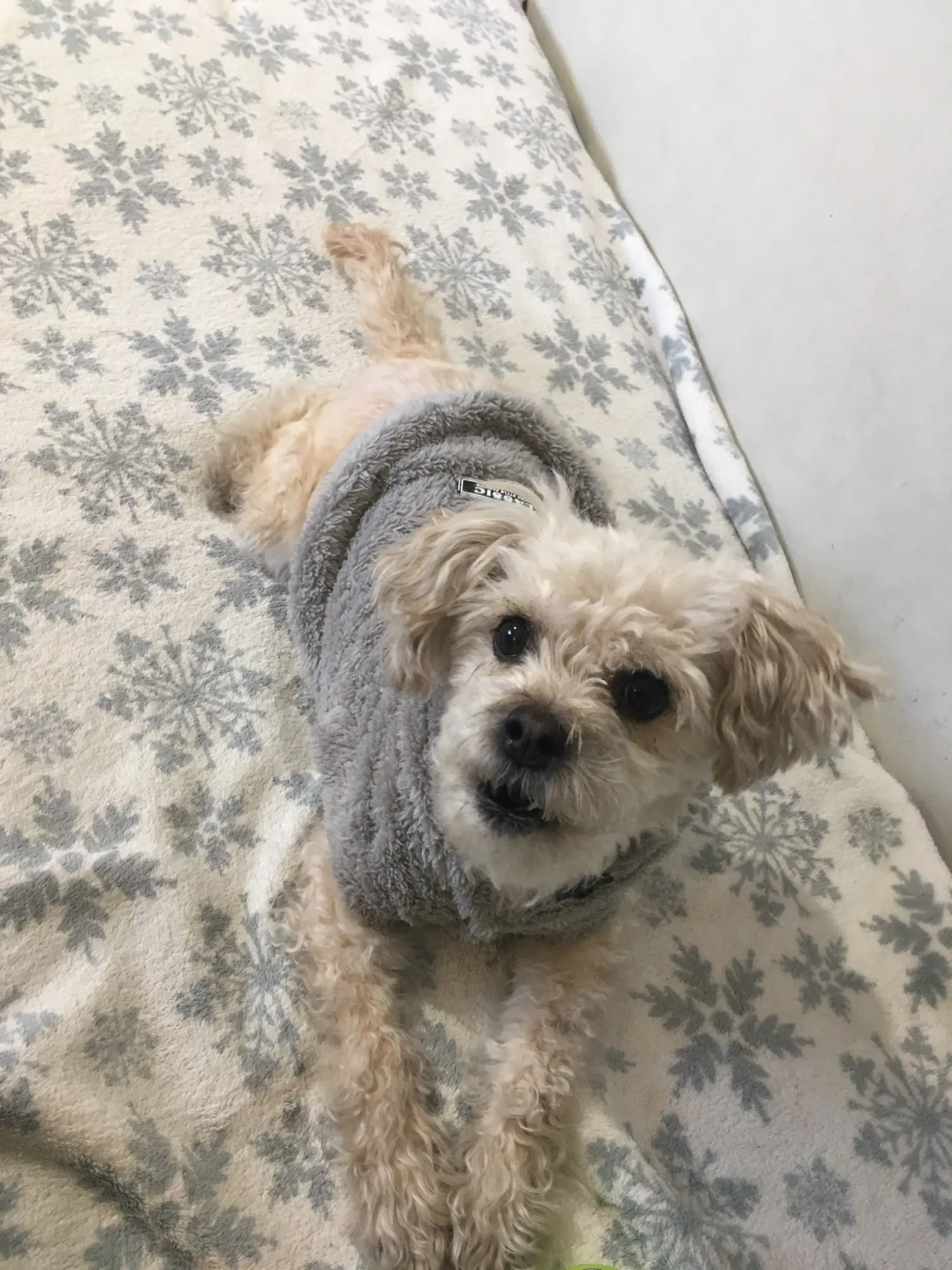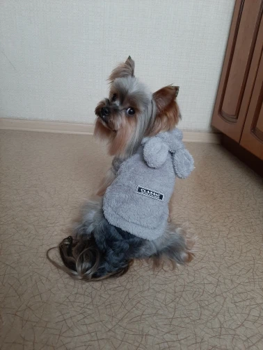 Очень приятная мягенькая толстовочка, но очень маленькая, М - ка на 2,5 кг на Йорка маленькая и узенькая.