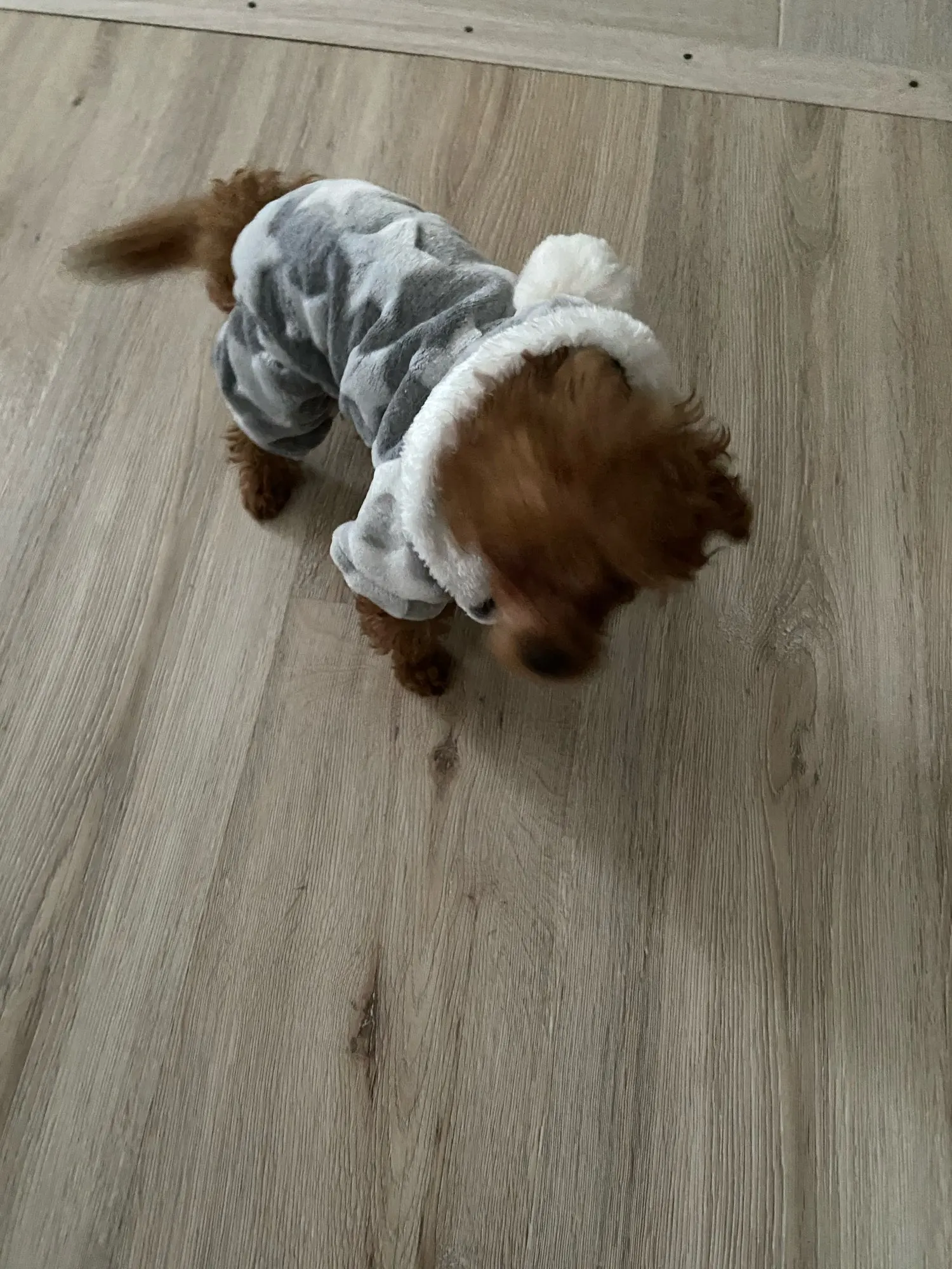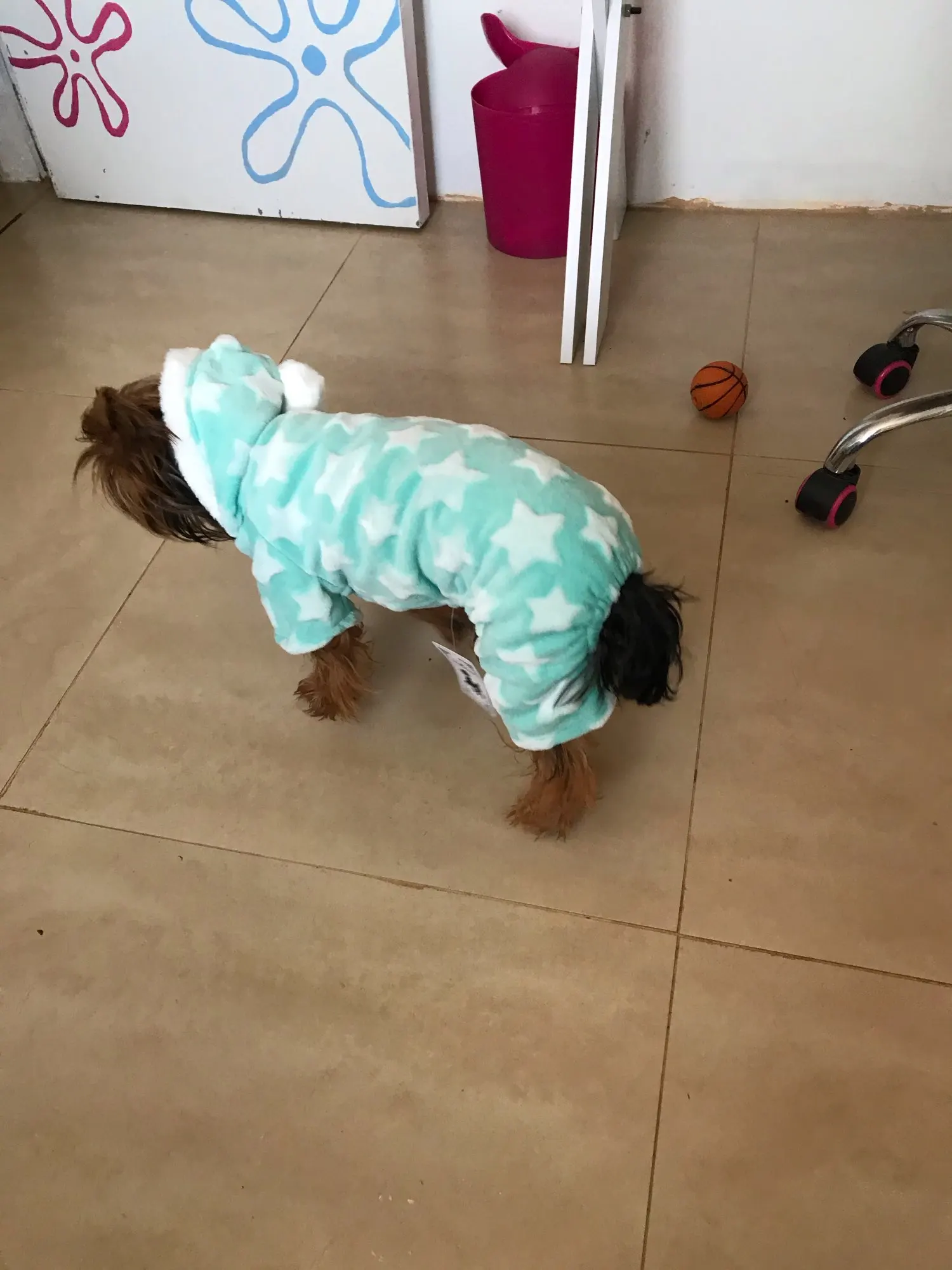 Заказ пришёл вовремя. Выбирала размер по отзывам и нам оказался впритык. На собаку 7 месяцев мальтийская болонка размер М впритык. Качество хорошее, но одевать не очень удобно так как нет застёжки или пуговиц на комбезе.