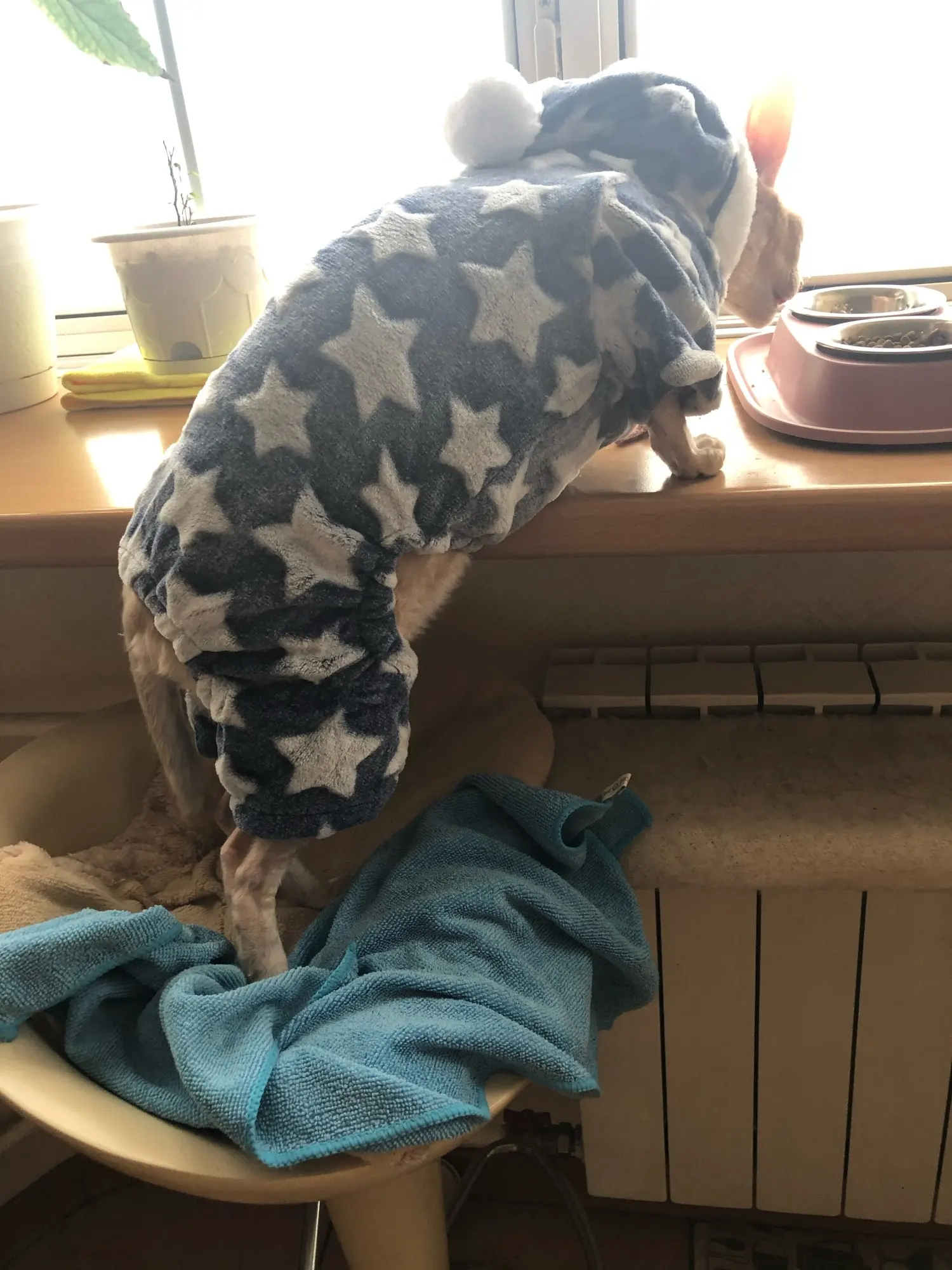 Пошив хороший, материал для лысых приятный. Надевать действительно не очень удобно , кот сопротивляется, но сидит хорошо. Хотя всё таки этот костюм я бы котам не рекомендовала. Во первых грудь широкая и он оттуда вылазит. Коты очень гибкие и поэтому при движениях и лежании лапы попадают во внутрь и вылезают в широкую горловину например. Или цепляются когтями за широкие рукава. Буду как то переделывать. Кстати на джек рассела подошёл костюмчик , только он ему не нужен.