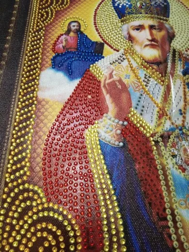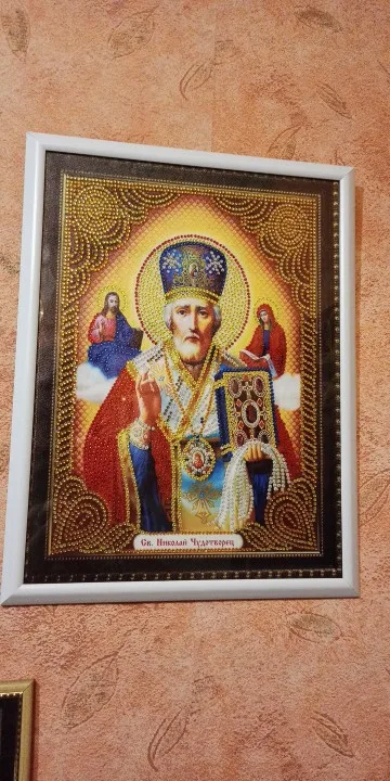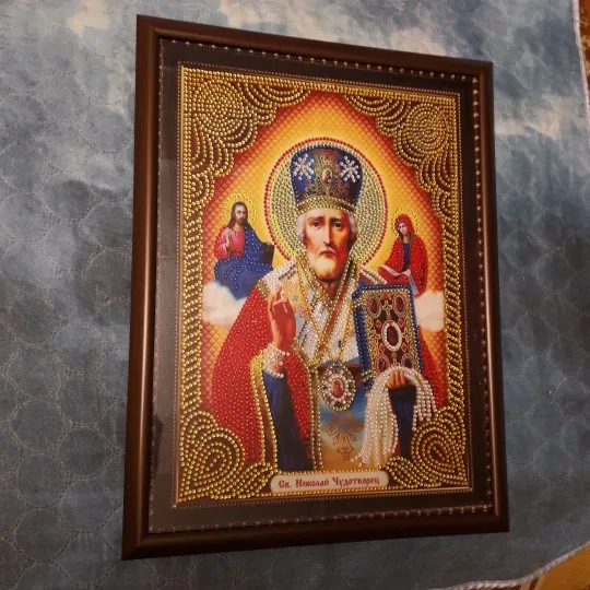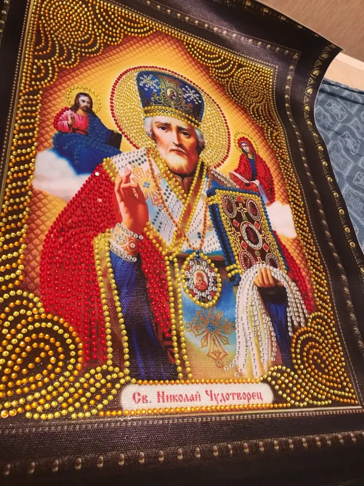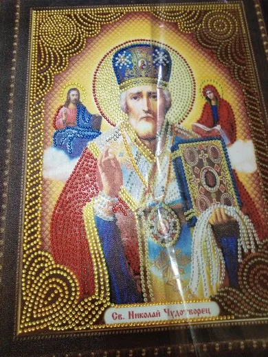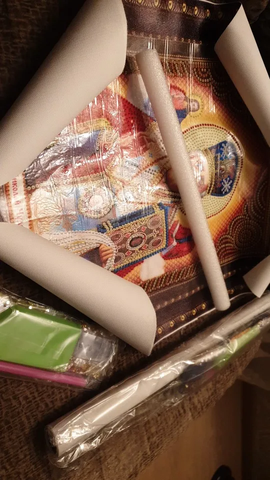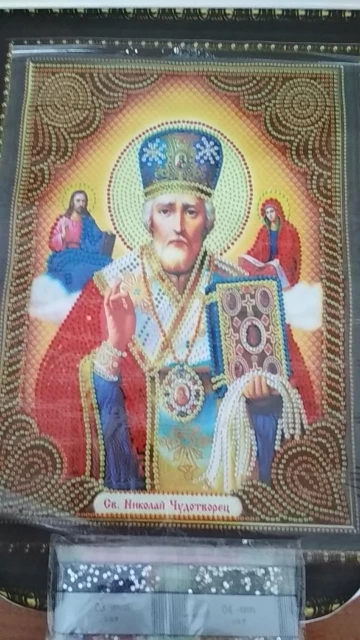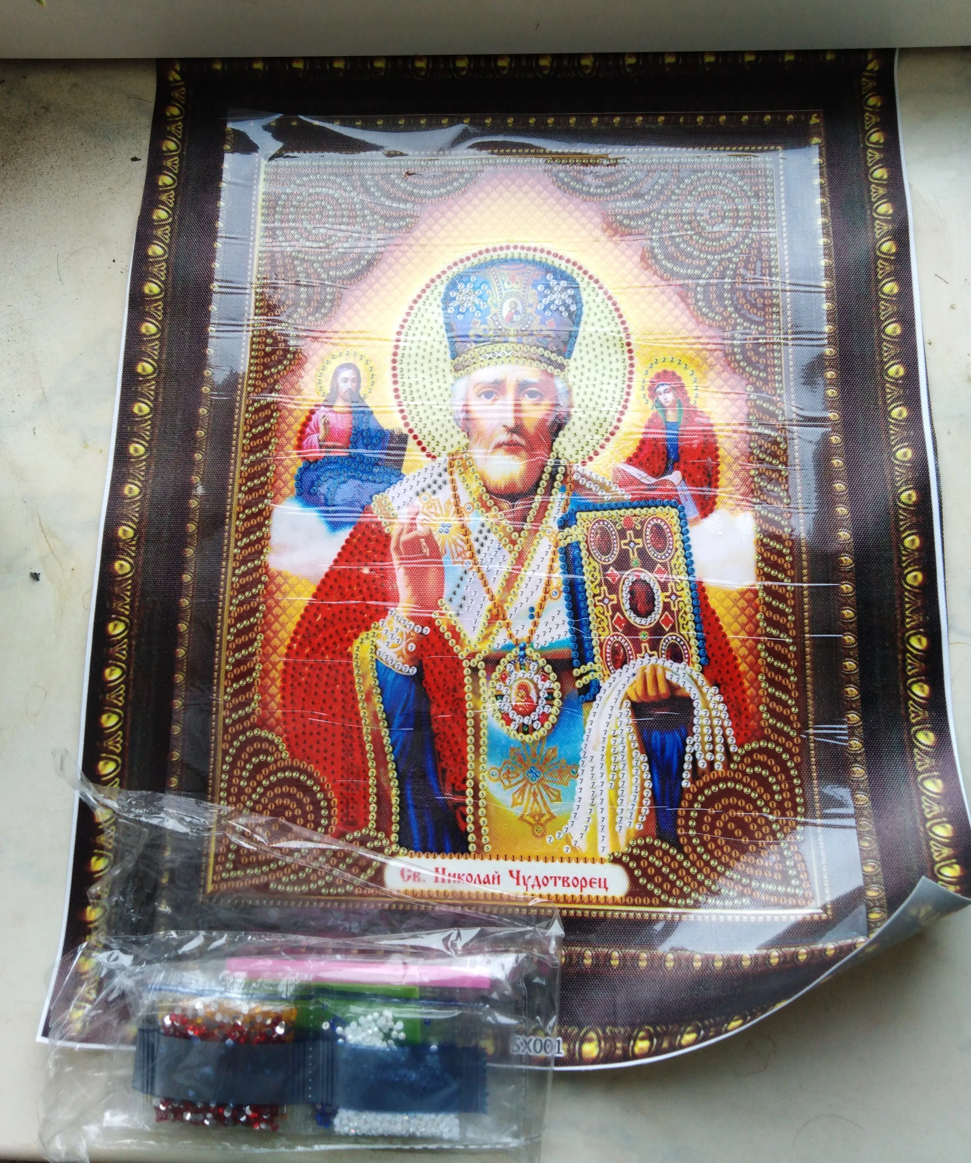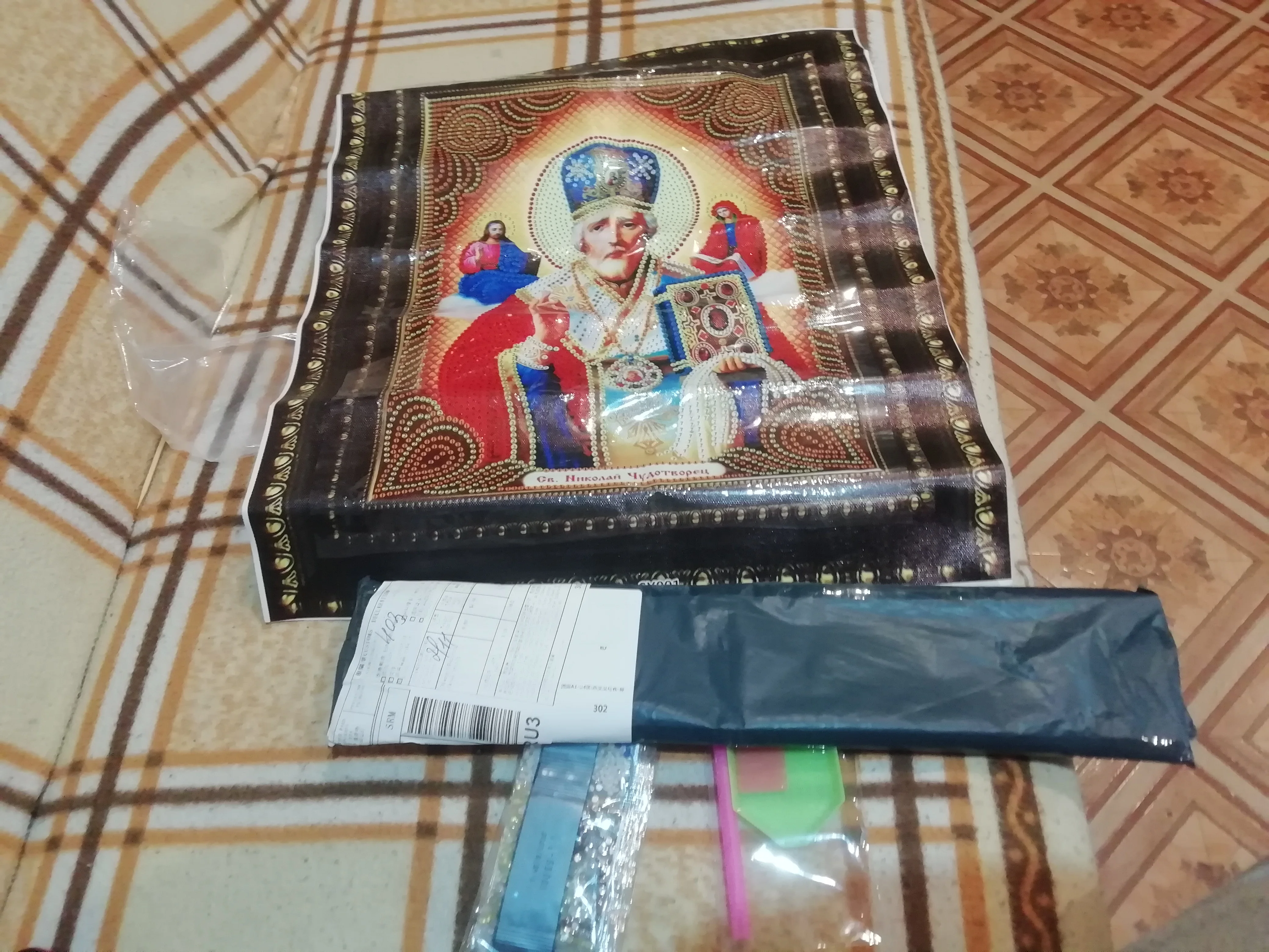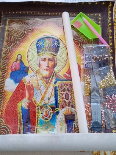 Заказ шёл три недели, картина отпечатана хорошо, не помята, стразы яркие, смотрится икона красиво!