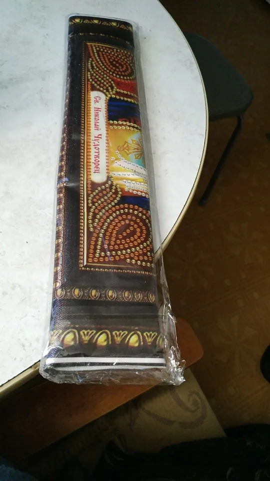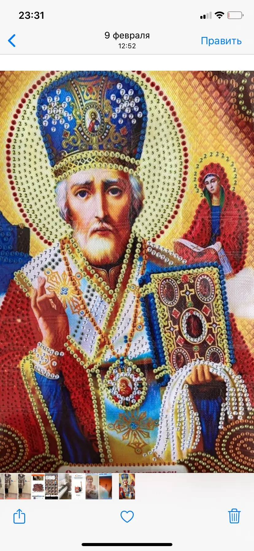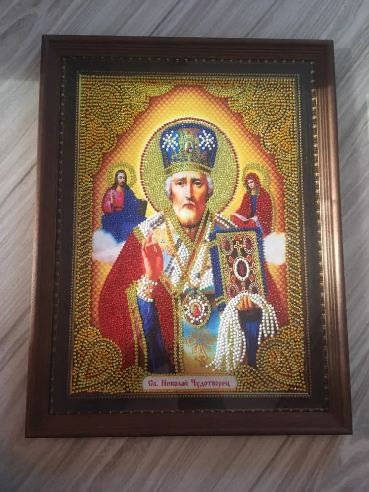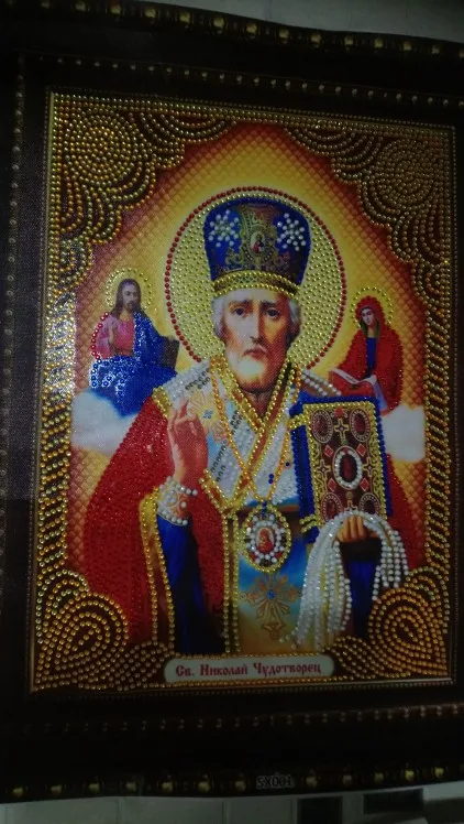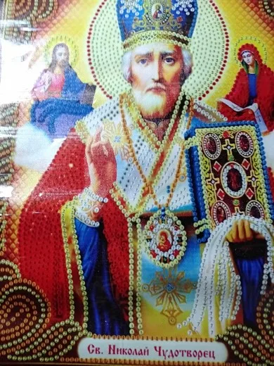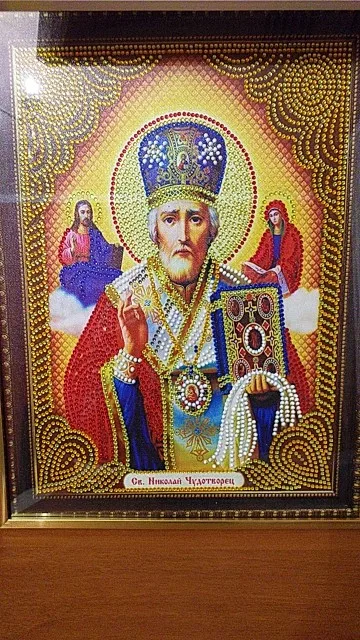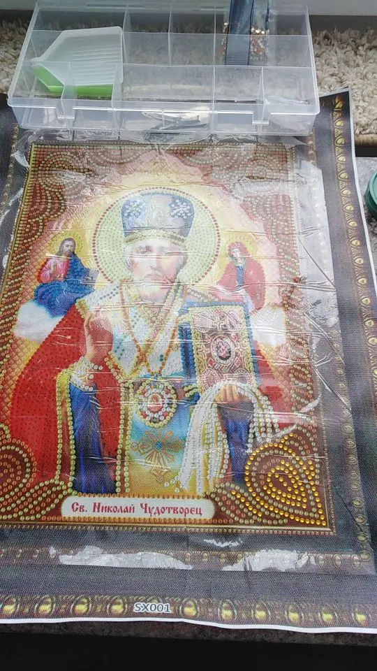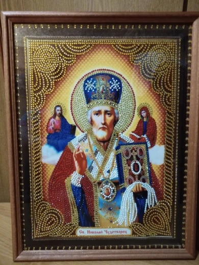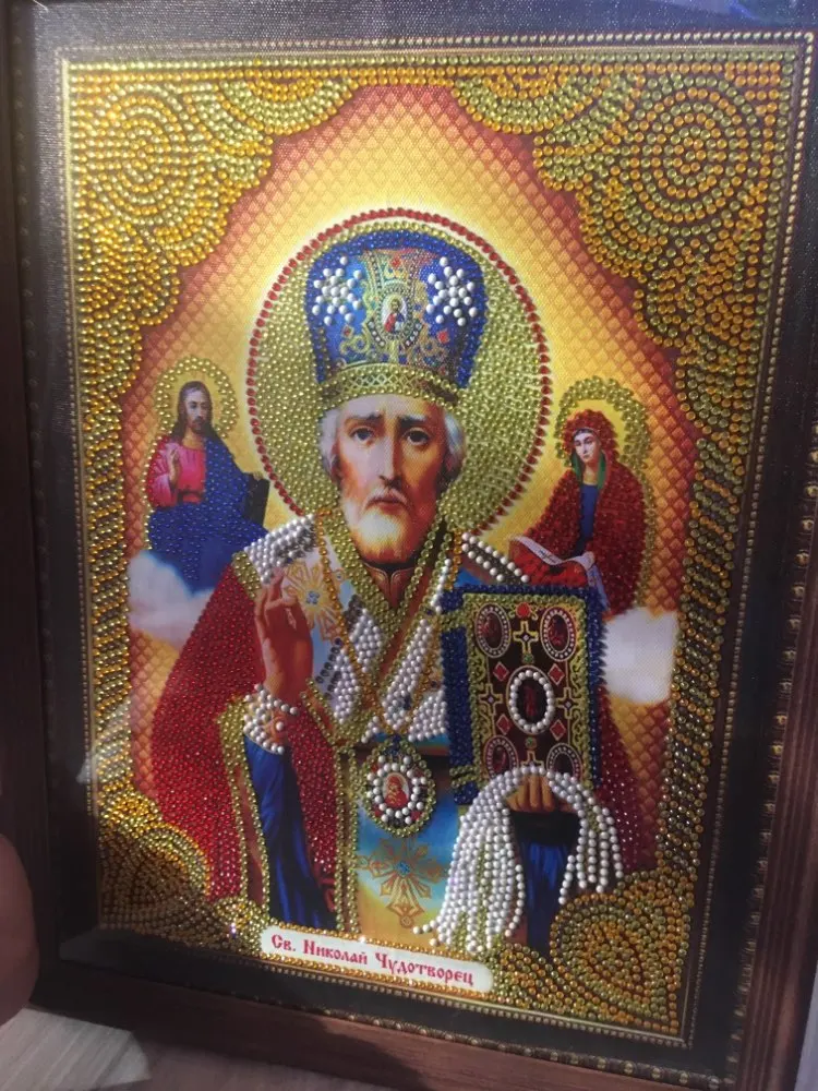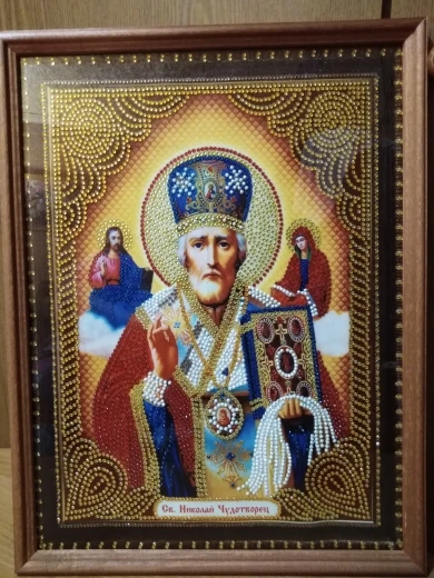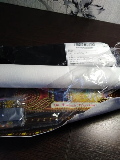 Заказ шёл три недели, картина отпечатана хорошо, не помята, стразы яркие, смотрится икона красиво!