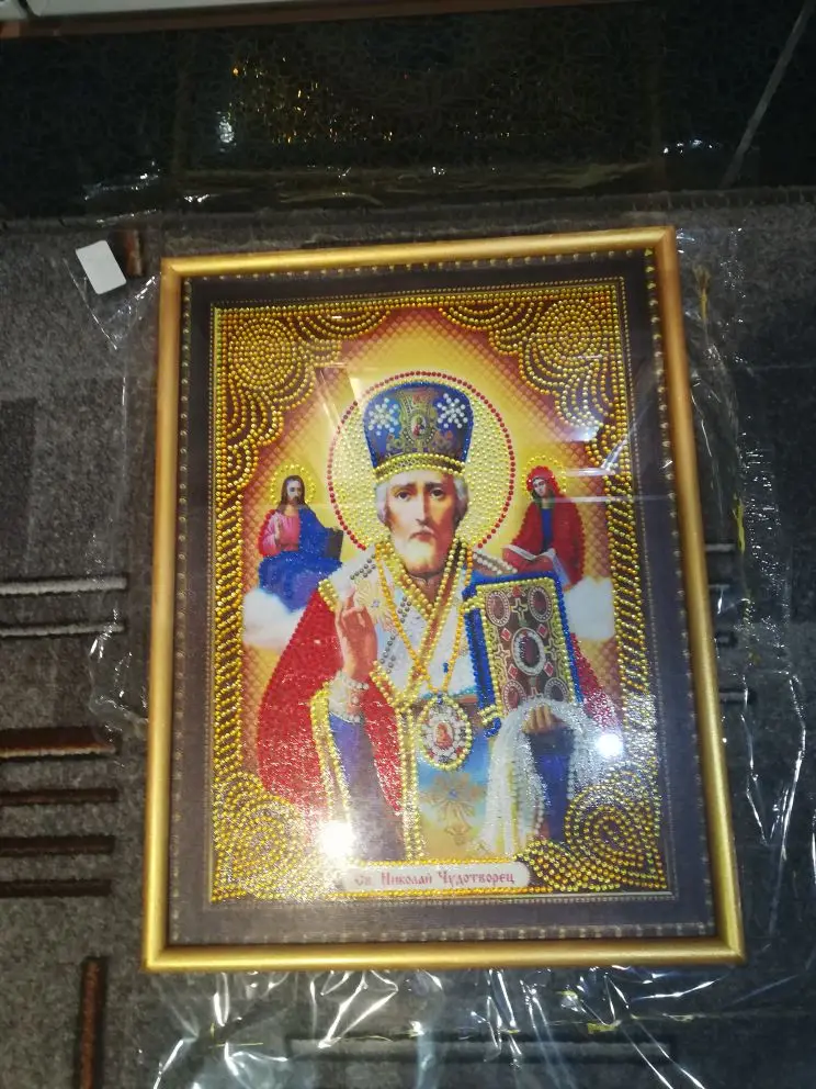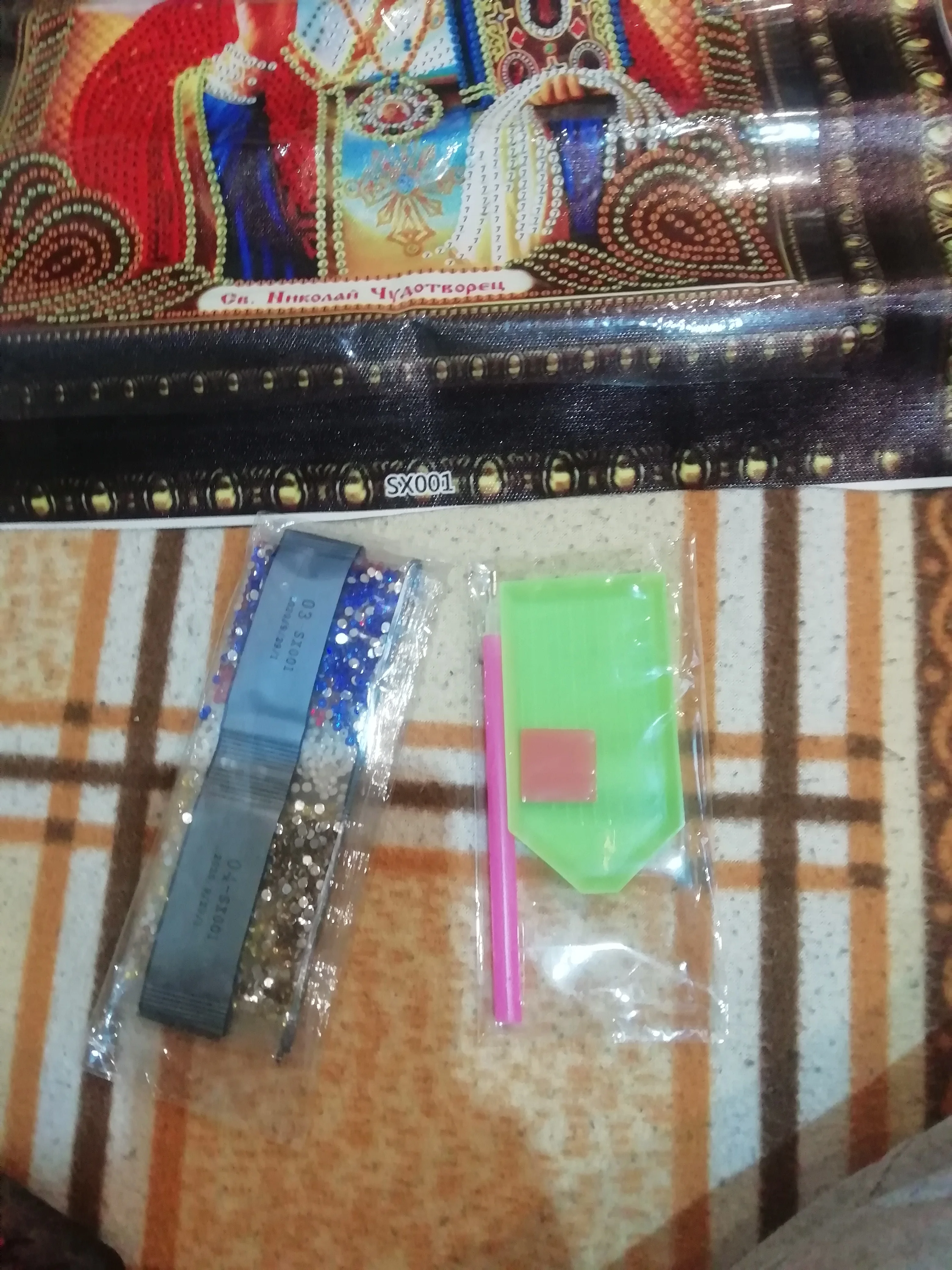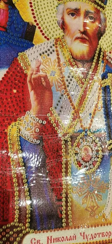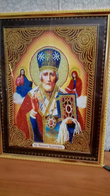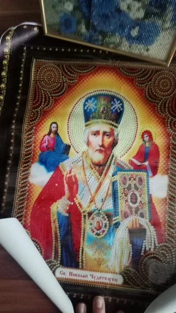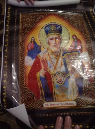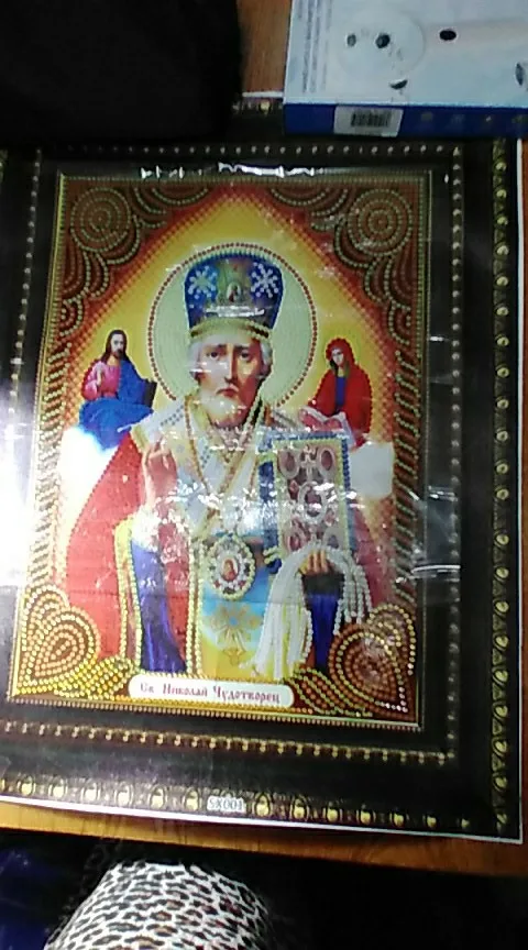 Картина смотрится круто.Камушки блестят, переливаеются.В общем как и положено иконе выглядит богато.Хорошо что лицо не заклеивается.Фото не добавил,потому что не передаст красоту и игру на свету.Про доставку тоже писать не буду.Она не всегда от продавца зависит.