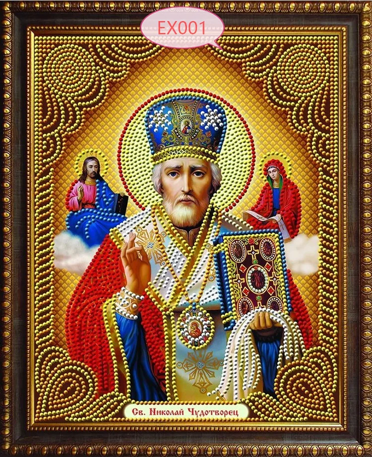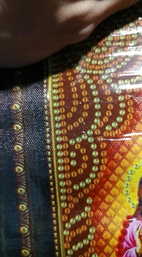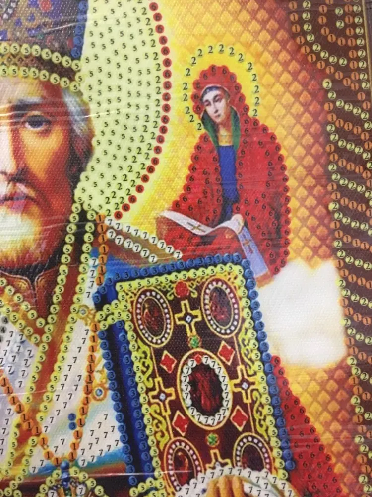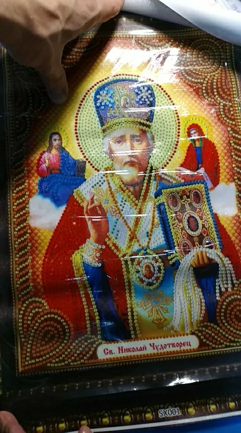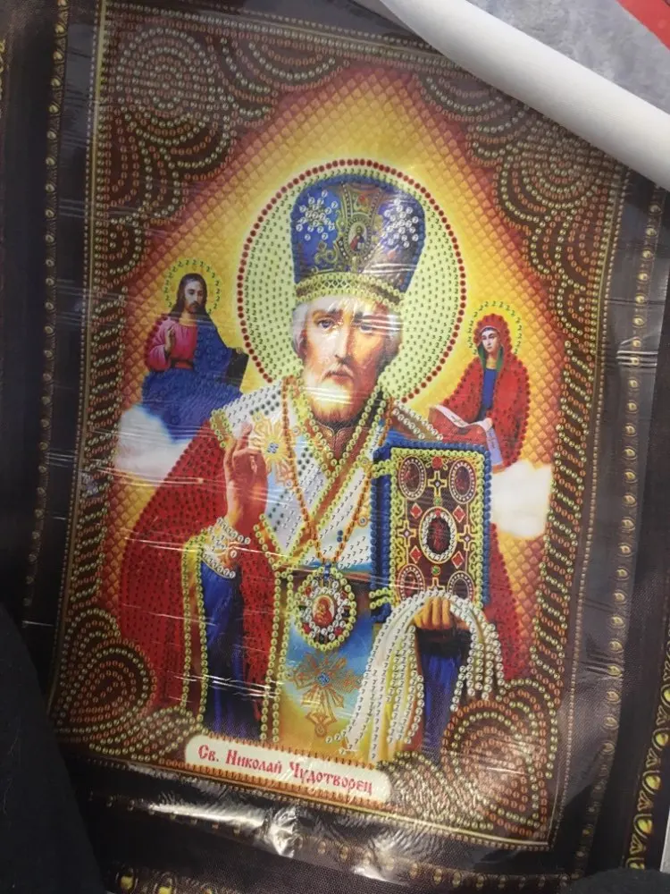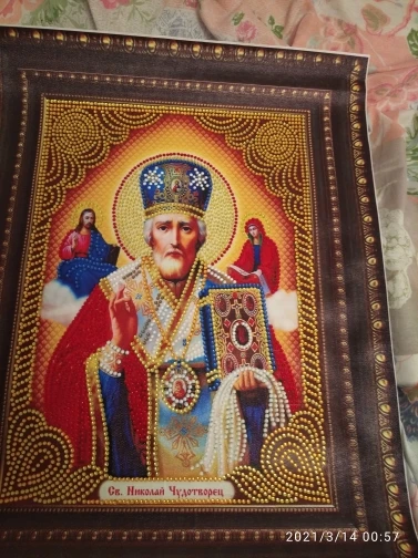 Картина смотрится круто.Камушки блестят, переливаеются.В общем как и положено иконе выглядит богато.Хорошо что лицо не заклеивается.Фото не добавил,потому что не передаст красоту и игру на свету.Про доставку тоже писать не буду.Она не всегда от продавца зависит.