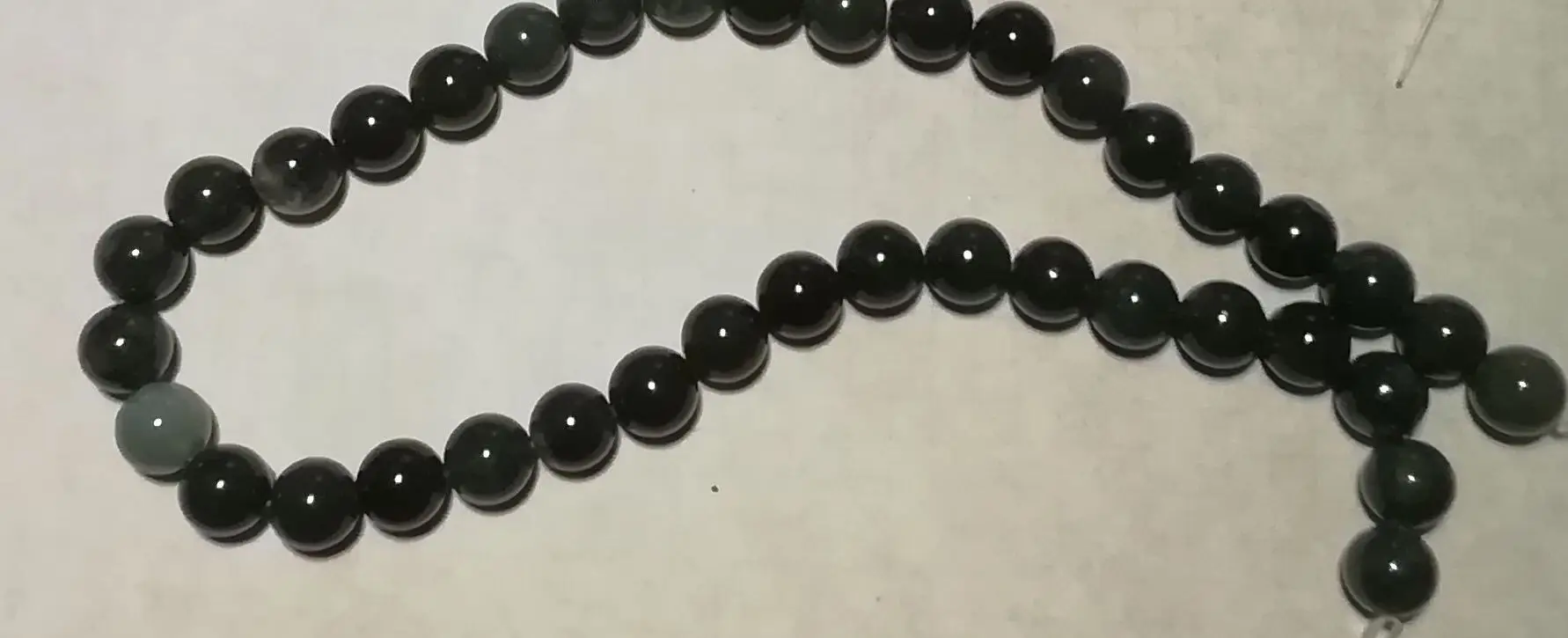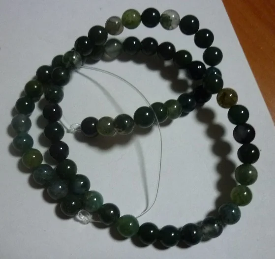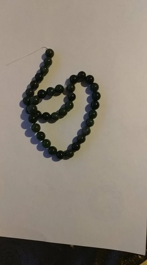 Гладкие, насыщенного цвета моховые агаты. Цвет действительно очень темный. Без фонарика не просвечивают. С обычным телефонным фонариком можно внутри каждой бусины разглядеть невероятные узоры. Но без освещения, увы, они практически черные :)