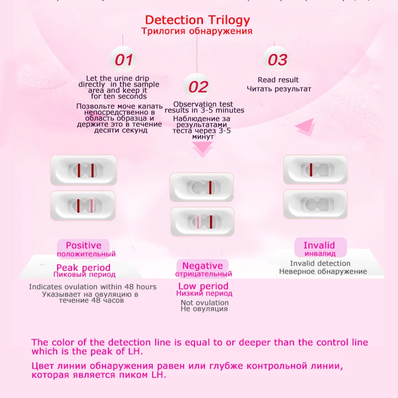 Использование: первый шаг-дать моче капать в области загрузки в течение 10 секунд. Второй шаг заключается в наблюдении за результатами испытаний в области тестирования в течение 3-5 минут. Третий шаг читает результатИнструкции: Не допускайте, чтобы уровень мочи превышал максимум (маркер линии), в противном случае тест может работать неправильно.Требуется полное время реакции 3 минуты, и ваш результат должен появиться в течение 3 минут. Не считывайте результаты через 5 минутКак читать результаты?Отрицательный: на области управления появляется только один цветной ремешок, или на тестовом ремешке появляется, но легче, чем на пульте управления. Это означает, что нет перенапряжения LH.Положительный: если видны две цветовые полосы, а тестовая полоса равна или темнее, чем контрольная полоса, вы, вероятно, овуляетесь в течение следующих 24-48 часов. Если вы хотите забеременеть, самое лучшее время для полового акта-это после 24 часов, но до 48 часов.Недопустимо: нет видимой ленты. Повторите с новым тестовым комплектом.Хранение и стабильность1. Храните от 39 до 86 °F (от 4 до 30 °C) в запечатанном мешке до истечения срока годности.2. Держите подальше от прямых солнечных лучей, влаги и тепла.3. Не замораживайте.