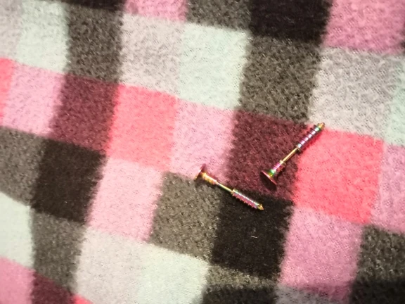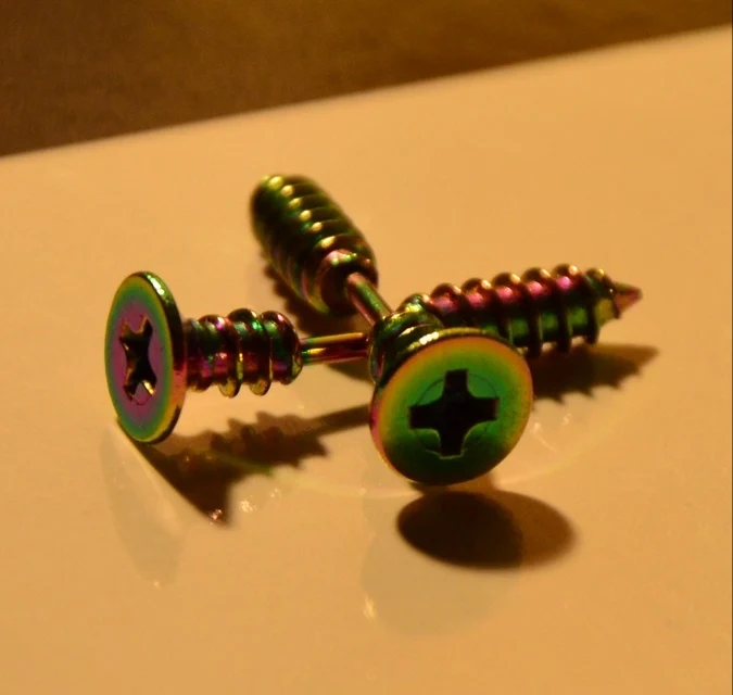 Сережки крутые,пришли быстро, за две недели в Ленинградскую область. Цвет красивый, переливаются, носить удобно, не мешают,очень легкие. И очень похожи на настоящие шурупы)