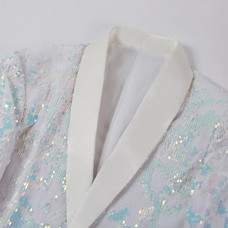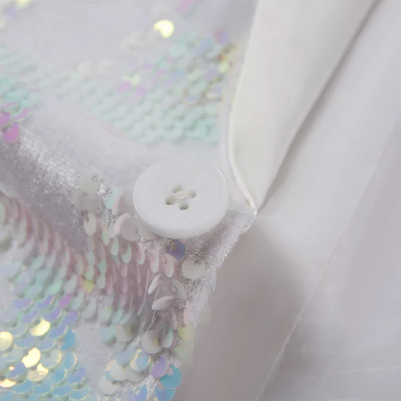 1. Ткань с бархатными блестками чистого белого цвета. Роскошные цвета, меняющиеся в разных направлении. Модный тренд и облегающий дизайн. 2, Тип застежки: одна пуговица 3, карман не является реальным. 4. Сезон: весна, осень, зима.