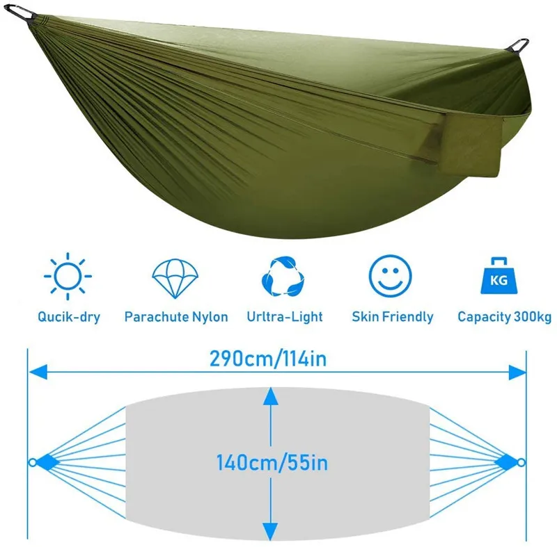 Гамак идеально подходит для любого уважающего себя искателя приключений, легкий, портативный и прочный в любой ситуации! Изготовлен из нейлона 210T парашютного типа, с нескользящей, высокой устойчивостью и плотной сеткой и полностью регулируемыми лямками длины. Этот гамак для кемпинга с сеткой мгновенно станет вашим любимым местом для путешествий или отдыха в саду!
