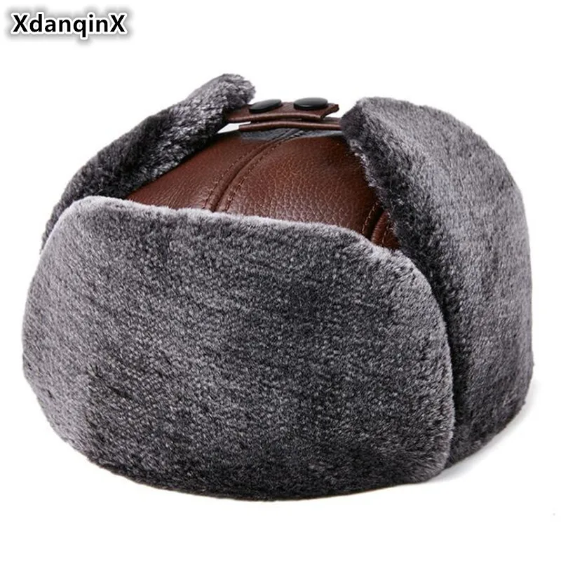 XdanqinX супертеплая Мужская зимняя меховая шапка, шапка из натуральной кожи, толстые бархатные шапки-бомберы, мужские лыжные шапки из яловой кожи, зимне наушники шапка
