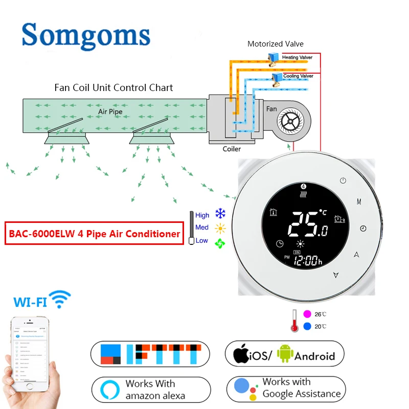 BAC-6000ALW: две трубы; Блок управления вентиляторной катушкой и два проводных моторизованных клапана. Подключение Wifi BAC-6000ELW: четыре трубы; Блок управления вентиляторной катушкой и два проводных тепловых клапана и два проводных охлаждающих клапана. Подключение Wifi
