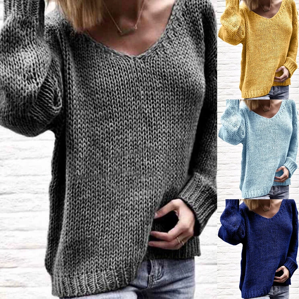 Повседневный женский свободный однотонный вязаный свитер, джемпер с V-образным вырезом и длинным рукавом, топ из трикотажной ткани, полиэстер, женский свитер из спандекса