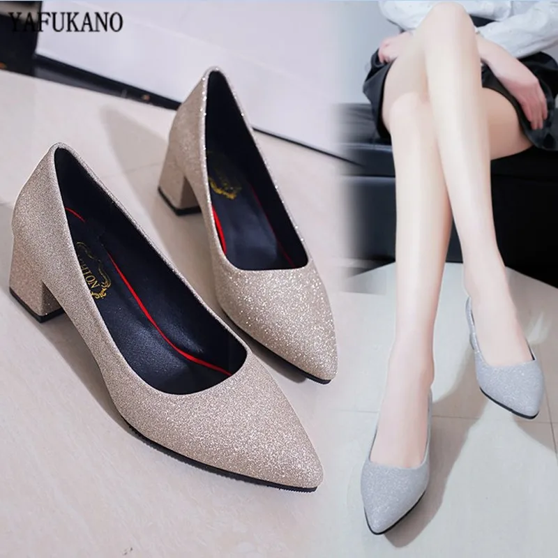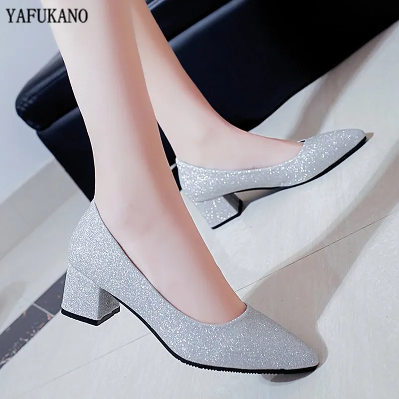 Туфли-лодочки женские весенне-осенние, серебристые, с закрытым носком, с блестками