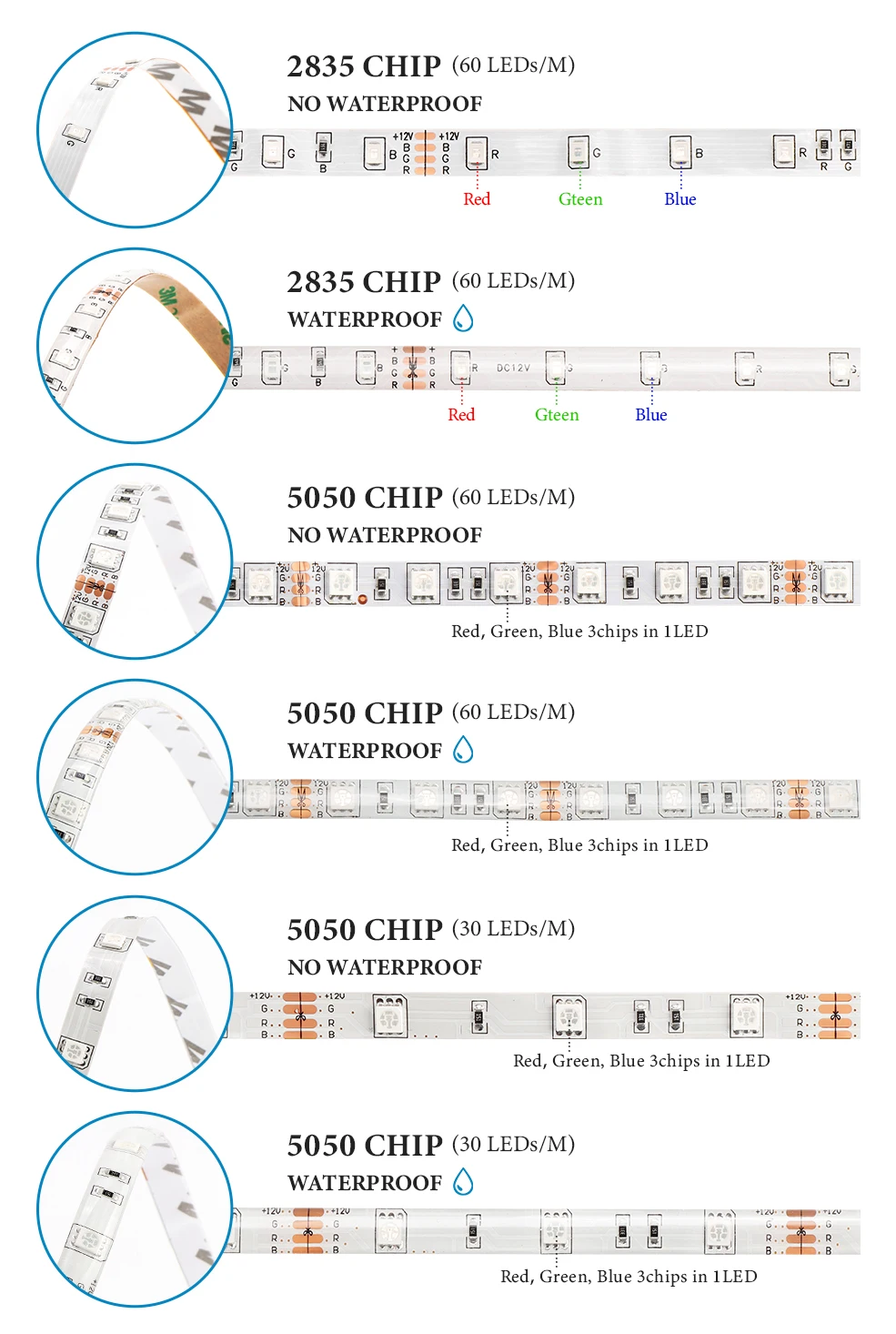Светодиодный да: SMD 5050 Количество: 5 метров, 30 светодиодов/м или 60 светодиодов/м Рабочее Входное напряжение: 12 В постоянного тока Рабочая температура: -20 ℃ ~ 60 ℃ Уровень водонепроницаемости: IP65 Водонепроницаемый или IP20 неводонепроницаемый Светодиодный да: SMD2835 Количество: 5 метров, 60 светодиодов/м Рабочее Входное напряжение: 12 В постоянного тока Рабочая температура: -20 ℃ ~ 60 ℃ Уровень водонепроницаемости: IP65 Водонепроницаемый или IP20 неводонепроницаемый