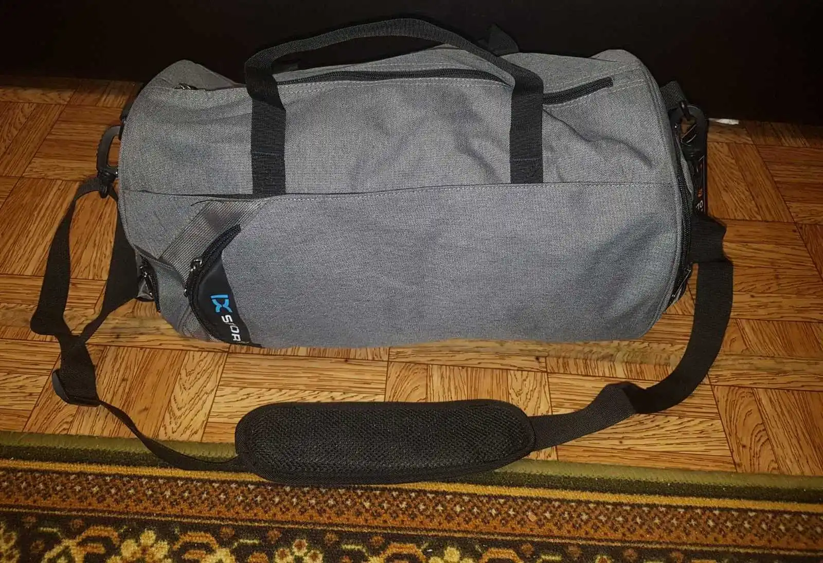 Отличная, удобная с разными отсеками сумка для занятий спортом. Влезли кроссовки в специальный отсек, футболка, штаны, всё для душа и бутылка с водой, даже ещё места остались. Лямку через плечо можно отстегнуть и носить сумку в руках.